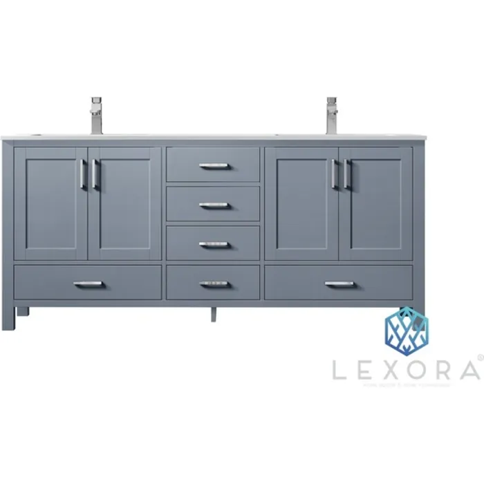 The Jacques vanity in dark grey from Lexora provides a beautiful, contemporary style to any bathroom. With sleek, clean lines and a cool, neutral finish, this vanity’s beauty is only matched by its seamless functionality. The cabinet doors and drawers feature soft-close hinges and slides to increase safety and ensure you never have to hear a slamming cabinet again. With solid birch and rubber wood construction, this piece is as durable as it is stunning. The Jacques vanity comes in different sizes and finishes to fit into any size bathroom and blends with any style.It also includes a matching countertop and ceramic undermount sinks, making it the one package you need to finish off your bathroom upgrade.