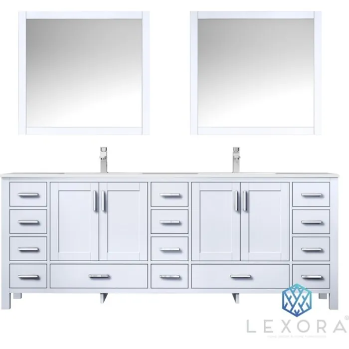 The Jacques vanity in white from Lexora provides a beautiful, contemporary style to any bathroom. With sleek, clean lines and a cool, neutral finish, this vanity’s beauty is only matched by its seamless functionality. The cabinet doors and drawers feature soft-close hinges and slides to increase safety and ensure you never have to hear a slamming cabinet again. With solid birch and rubber wood construction, this piece is as durable as it is stunning. The Jacques vanity also comes in different sizes and other finishes to fit into any size bathroom and blends with any style. Every vanity also includes a matching stone countertop, mirrors with matching wood frame and ceramic undermount sinks, making it the one package you need to finish off your bathroom upgrade.