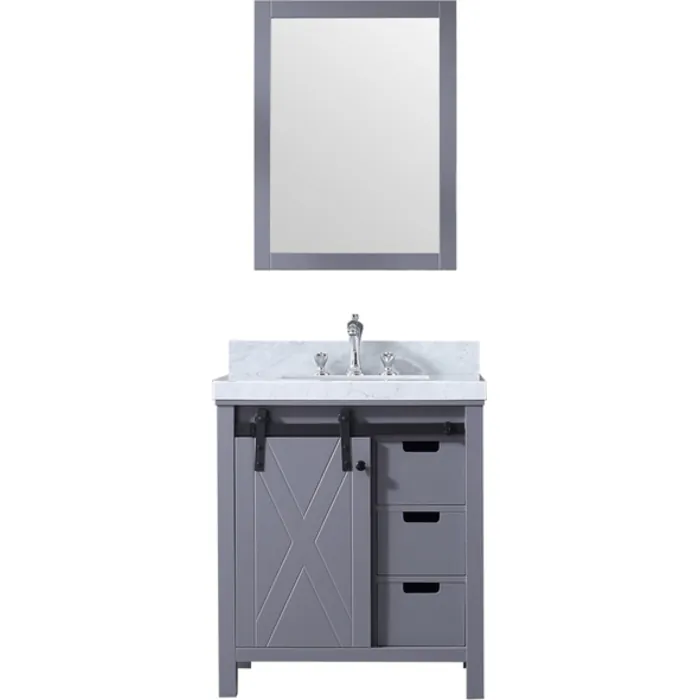 Lexora 30 inch Dark Grey Single Bathroom Vanity Set with White Carrara Marble Top with White Ceramic Square Undermount Sink and 28 inch Mirror LM342230SBBSM28