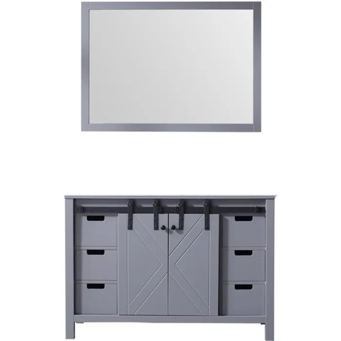 The Marsyas vanity in dark grey features a unique blending of modern style with rustic design elements to create a piece that makes a beautiful addition to any bathroom. The sliding, barn-style cabinet doors give this vanity a truly unique touch. Constructed of solid birch and rubber wood, with superior moisture resistance, this piece’s style is only matched by its dependability. With an included mirror with matching wood frame, the Marsyas vanity is the perfect set for finishing off your bathroom remodel.