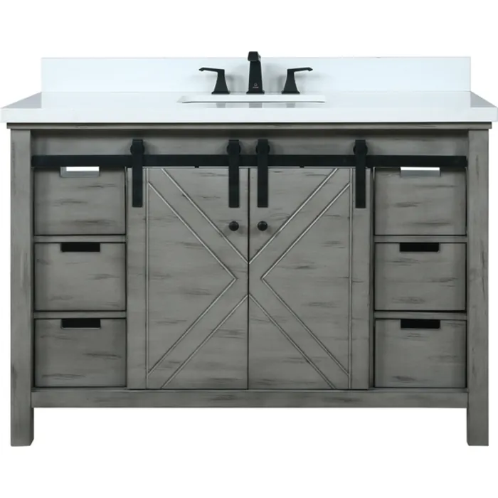 The Marsyas vanity in Ash Grey features a unique blending of modern style with rustic design elements to create a piece that makes a beautiful addition to any bathroom. The smooth, modern lines and cool-toned finish are paired with a matching countertop of solid stone. But the sliding, barn-style cabinet doors give this vanity a truly unique touch. Constructed of solid birch and rubber wood, with superior moisture resistance, this piece’s style is only matched by its dependability. With an included sink, the Marsyas vanity is the perfect set for finishing off your bathroom remodel.