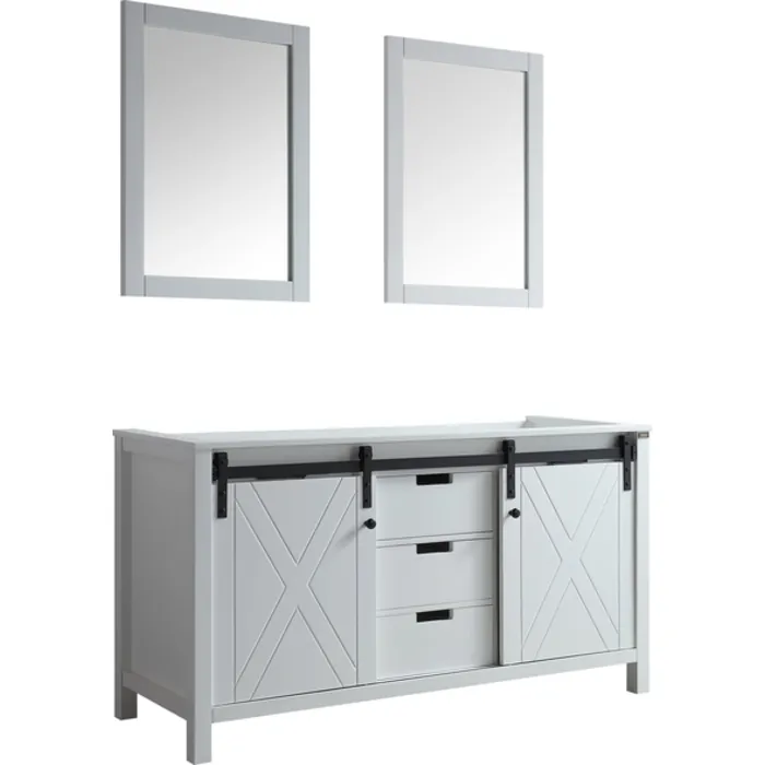 The Marsyas vanity in white features a unique blending of modern style with rustic design elements to create a piece that makes a beautiful addition to any bathroom. The sliding, barn-style cabinet doors give this vanity a truly unique touch. Constructed of solid birch and rubber wood, with superior moisture resistance, this piece’s style is only matched by its dependability. With included mirrors with matching wood frame, the Marsyas vanity is the perfect set for finishing off your bathroom remodel.