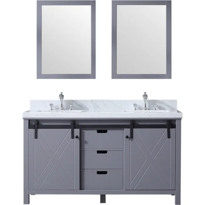 Lexora 60 inch Dark Grey Double Bathroom Vanity Set with White Carrara Marble Top with White Ceramic Square Undermount Sinks and 24 inch Mirrors LM342260DBBSM24