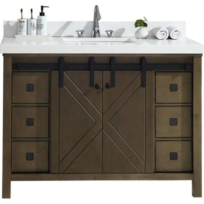 The Marsyas Veluti vanity in rustic brown features a unique blending of modern style with rustic design elements to create a piece that makes a beautiful addition to any bathroom. The smooth, modern lines and cool-toned finish are paired with a matching countertop of solid stone. But the sliding, barn-style cabinet doors give this vanity a truly unique touch. Constructed of solid birch and rubber wood, with superior moisture resistance, this piece’s style is only matched by its dependability. With an included sink, the Marsyas Veluti vanity is the perfect set for finishing off your bathroom remodel.