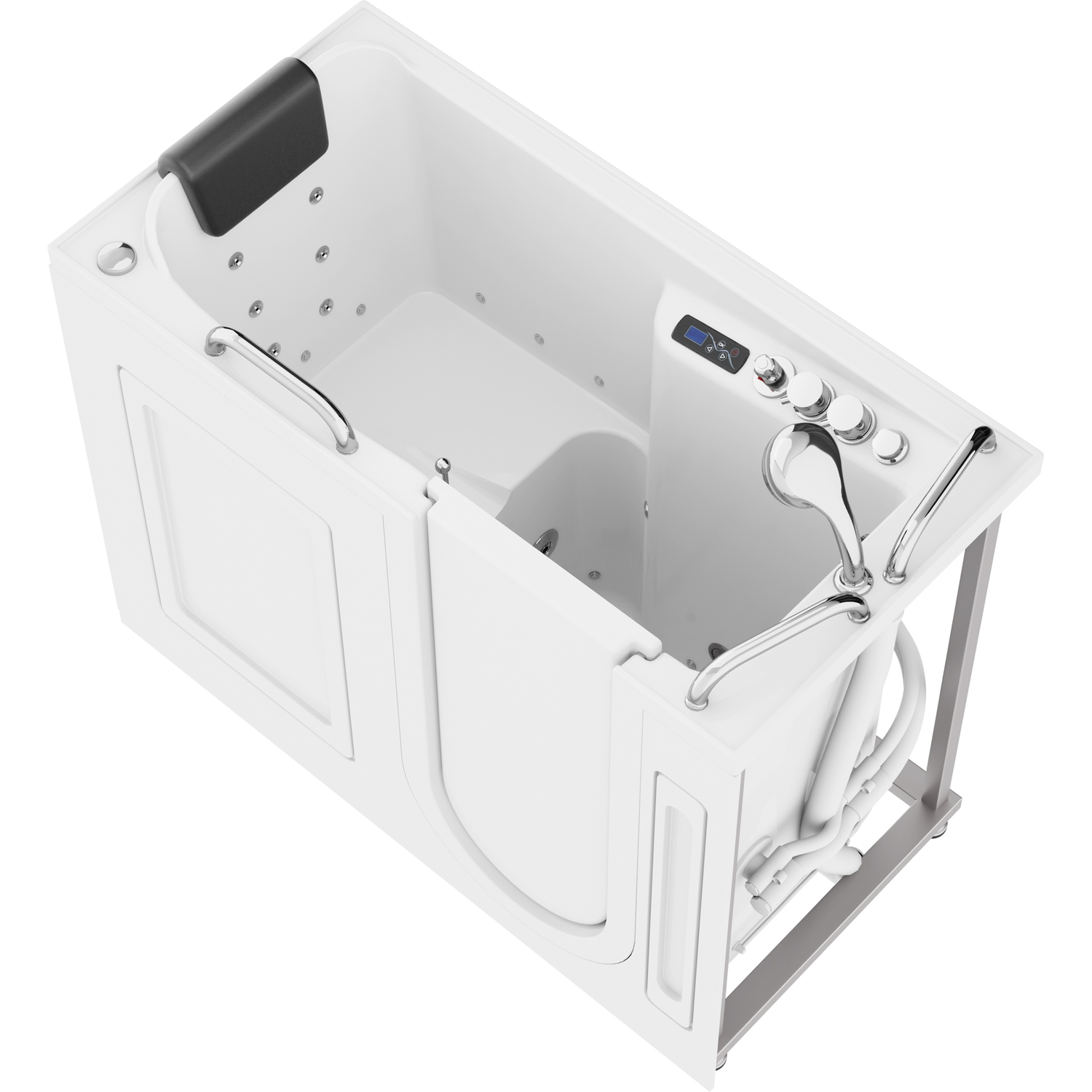 Wide opening door with a Lifetime Warranty protected watertight pressure seal10 fully adjustable hydro-therapeutic whirlpool massage jets18 Acu-Stream air jets for a soothing total body aero-therapeutic massageInline maintenance heater helps maintain water temperature at a comfortable levelIncludes Quick Fill faucet which rapidly fills the tub with water and features a handheld Euro-Grip shower head with a 60" reachAromatherapy - Experience the deeply soothing sensation of enveloping yourself in the rich fragrance of MediSpa's aroma infused massage bubbles.Chromatherapy - Reinvigorate your mind as well as your body by basking in the soothing radiance of Chromatherapy colored light bathingGlossy White marine grade Acrylic with fiberglass reinforcement and a freestanding steel support frameThe built in Safe Reach grab bars provide vital points of support and balance to help ease your transition into and out of the bathtubSoft touch total control console operates all major spa featuresSafety suite features include the easy step low threshold, secure footing slip-resistant flooring and ADA compliant built-in seatPolished chrome trimmed buttons, jets and hardware exude a modern flairExtension Kit - 7" matching extension kit included for 60" retro fit installationNo tile flange