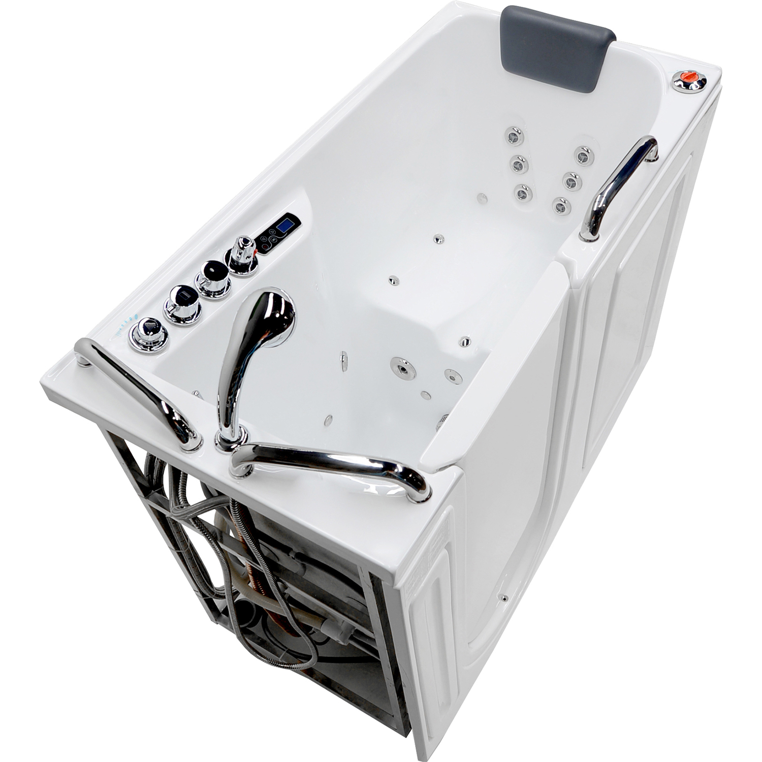 Wide opening door with a Lifetime Warranty protected watertight pressure seal12 fully adjustable hydro-therapeutic whirlpool massage jets18 Acu-Stream air jets for a soothing total body aero-therapeutic massageInline maintenance heater helps maintain water temperature at a comfortable levelIncludes Quick Fill faucet which rapidly fills the tub with water and features a handheld Euro-Grip shower head with a 60" reachAromatherapy - Experience the deeply soothing sensation of enveloping yourself in the rich fragrance of MediSpa's aroma infused massage bubbles.Chromatherapy - Reinvigorate your mind as well as your body by basking in the soothing radiance of Chromatherapy colored light bathingGlossy White marine grade Acrylic with fiberglass reinforcement and a freestanding steel support frameThe built in Safe Reach grab bars provide vital points of support and balance to help ease your transition into and out of the bathtubSoft touch total control console operates all major spa featuresSafety suite features include the easy step low threshold, secure footing slip-resistant flooring and ADA compliant built-in seatPolished chrome trimmed buttons, jets and hardware exude a modern flairExtension Kit - 7" matching extension kit included for 60" retro fit installationNo tile flange