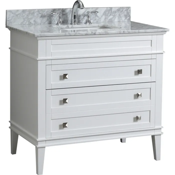 The transitional Rivoli collection includes a vanity cabinet with soft drawers,an authentic Italian marble pre- installed counter top and under mount ceramic sink.The Rivoli features tapered pyramid legs, recessed drawer faces, and raised border detailing with square metal hardware that complements the robust rectangular frame of the Rivoli. The Rivoli cabinet frame, doors and drawers are Pine wood. There is no MDF used in the construction of this vanity. The drawer interiors have a natural finish. Includes back splash