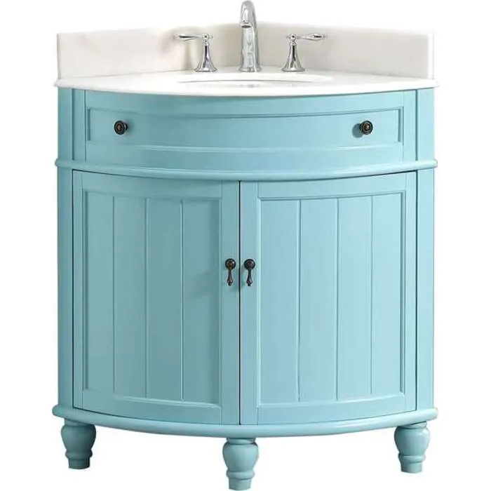 The perfect space saving solution for a small bathroom or powder room is the Angolo corner vanity by Modetti. This vanity combines classic elegance with cottage style. It boasts a white marble top with an under-mount sink and soft-close doors. Constructed of birch and MDF for strength, the furniture-quality piece features a blue finish and oil-rubbed bronze hardware. Decorative pendant pulls and knobs add further fine furniture details, while spacious storage keeps all your bathroom products tidy.