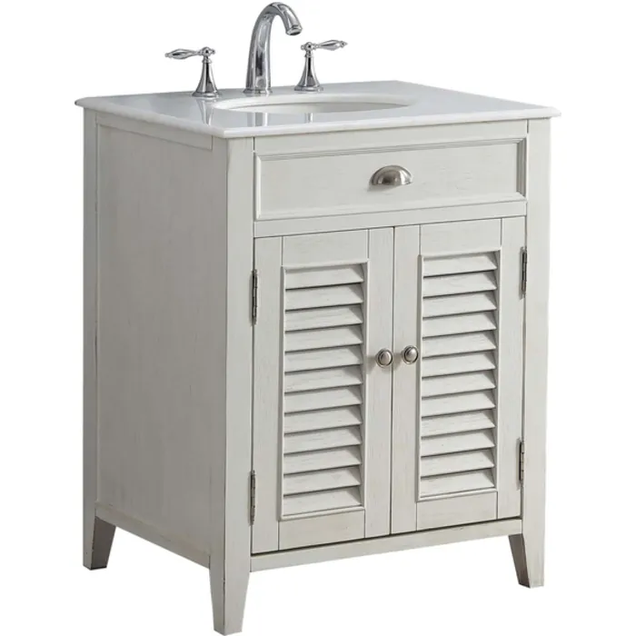 The plantation-inspired look of this Cottage/Beach style sink cabinet will add casual elegance to any bathroom decor. Shutter-style door with white finish, this bathroom vanity offers a look that will create a relaxing retreat in any home.
