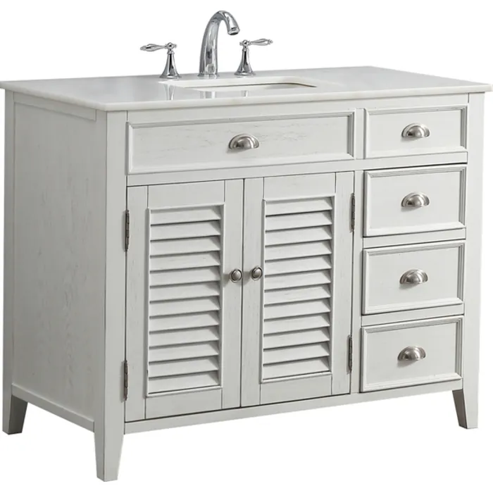 The plantation-inspired look of this Cottage/Beach style sink cabinet will add casual elegance to any bathroom decor. Shutter-style door with white finish, this bathroom vanity offers a look that will create a relaxing retreat in any home.