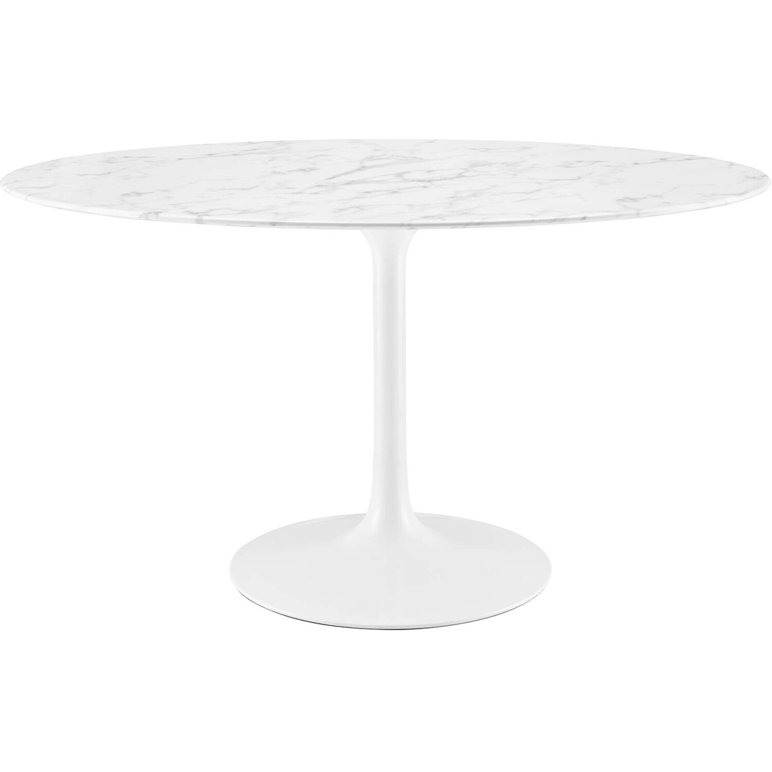 Let modern inspiration flow while gathered around the Lippa 54" Oval Artificial Marble Dining Table. Perfect for entertaining family and friends or everyday dining, this pedestal table comfortably seats four. Its oval tabletop is crafted with artificial marble and beveled edge for a contemporary yet timeless design. Embodying an iconic mid-century silhouette, this pedestal dining table floats on a sleek tapered metal pedestal base with a chip-resistant lacquered finish. Includes non-marking felt pad to protect flooring. Assembly required.Modern Dining Table