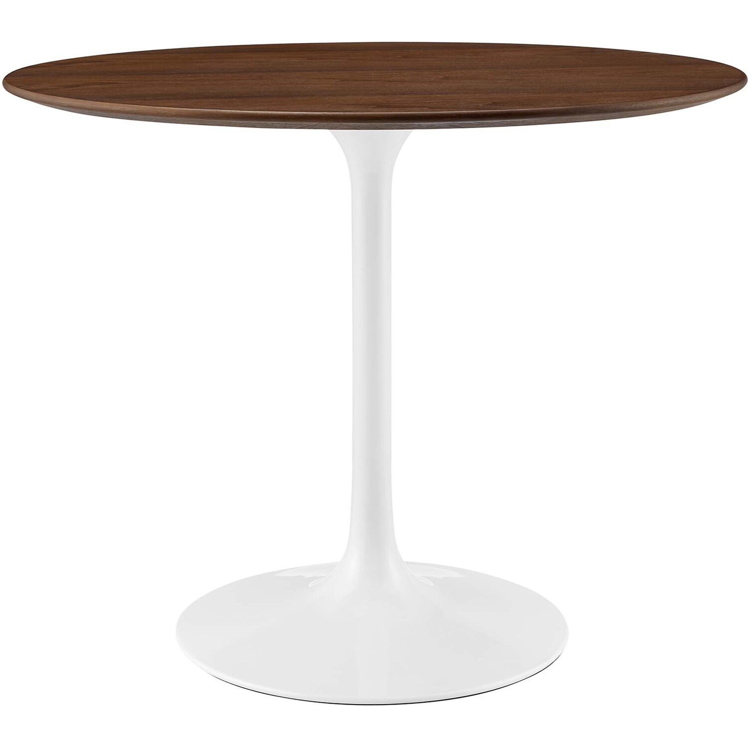 Let modern inspiration flow while gathered around the Lippa 36" Round Walnut Dining Table. Perfect for entertaining family and friends or everyday dining, this pedestal table comfortably seats two. Its round tabletop is crafted with MDF with walnut wood veneer and beveled edge for a contemporary yet timeless design. Embodying an iconic mid-century silhouette, this pedestal dining table floats on a sleek tapered metal pedestal base with a chip-resistant lacquered finish. Includes non-marking felt pad to protect flooring. Assembly required.Modern Dining Table