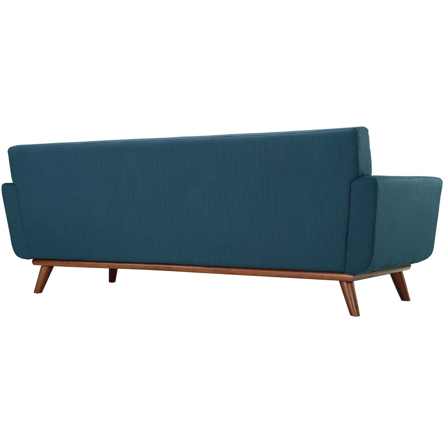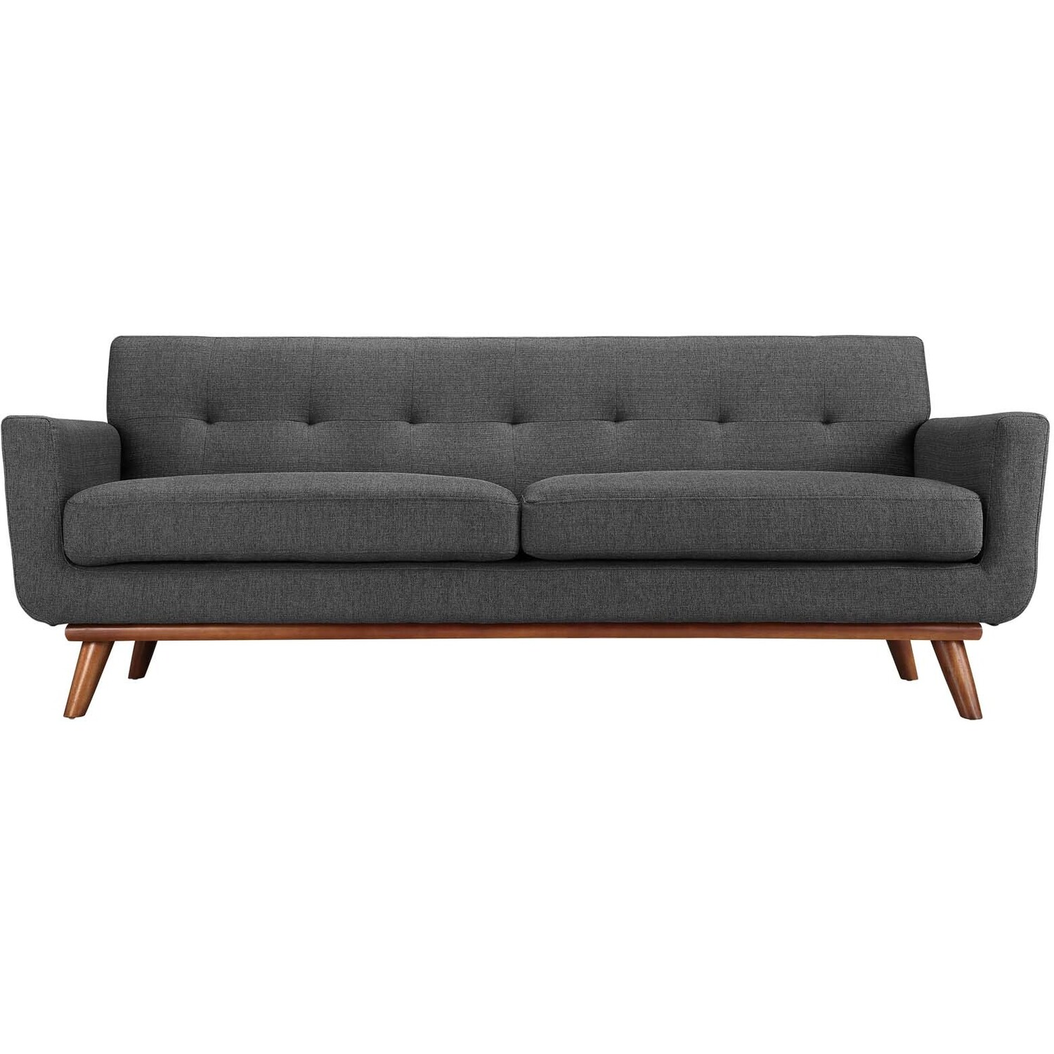 Gently sloping curves and plush seat cushion create a favorite lounging spot. Whether relaxing after a long day at work, settling in with coffee and brunch, or entering a spirited discussion with friends, the Engage Sofa is a welcome presence in your home. Three tufted buttons create eye-catching appeal, adding depth that brings your sitting décor to center stage. Four cherry color rubberwood legs and frame supply a solid base to the comfortable upholstered material.Upholstered Sofa