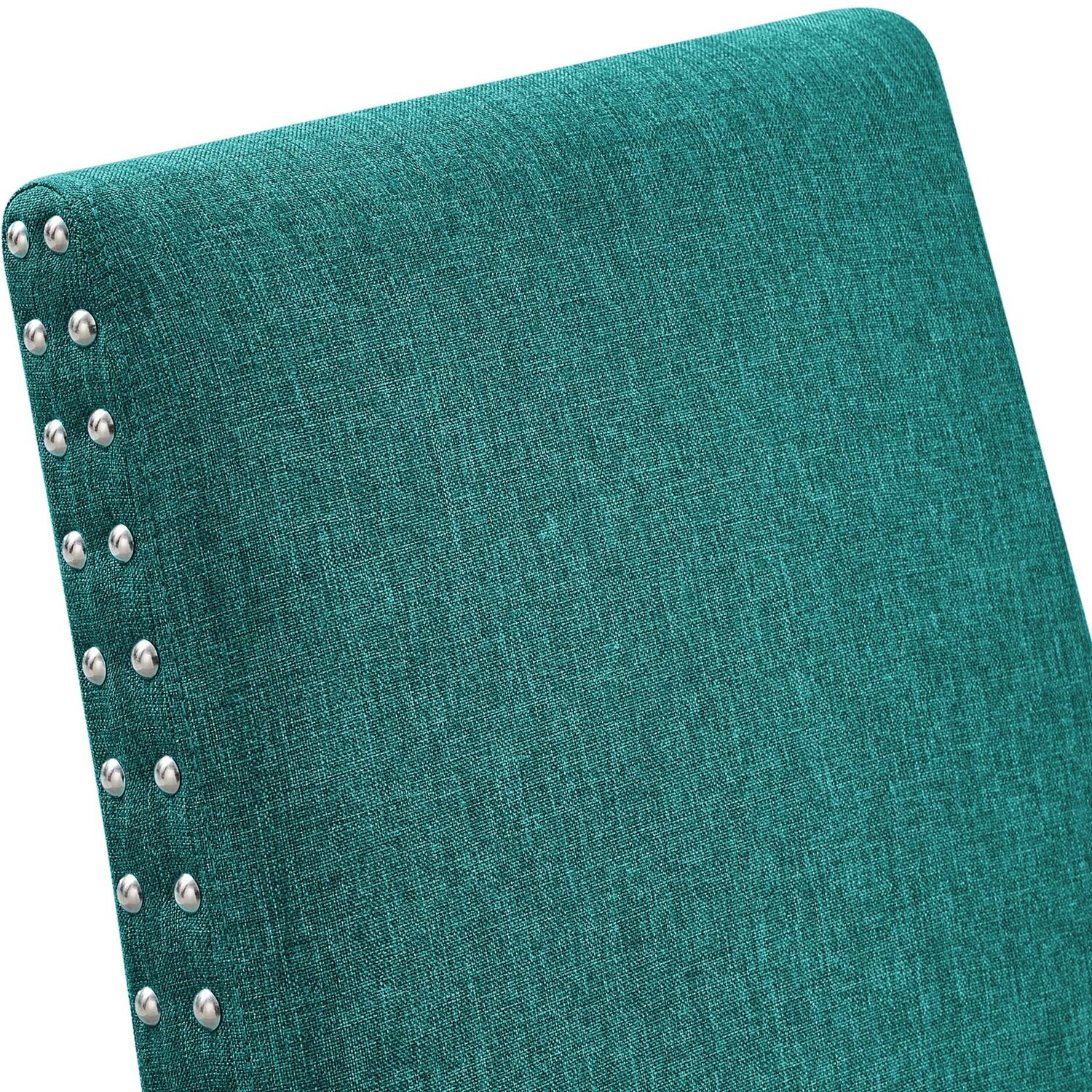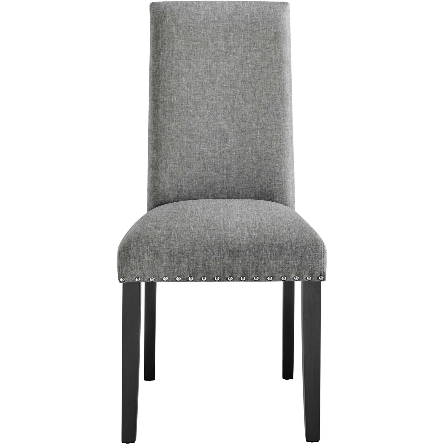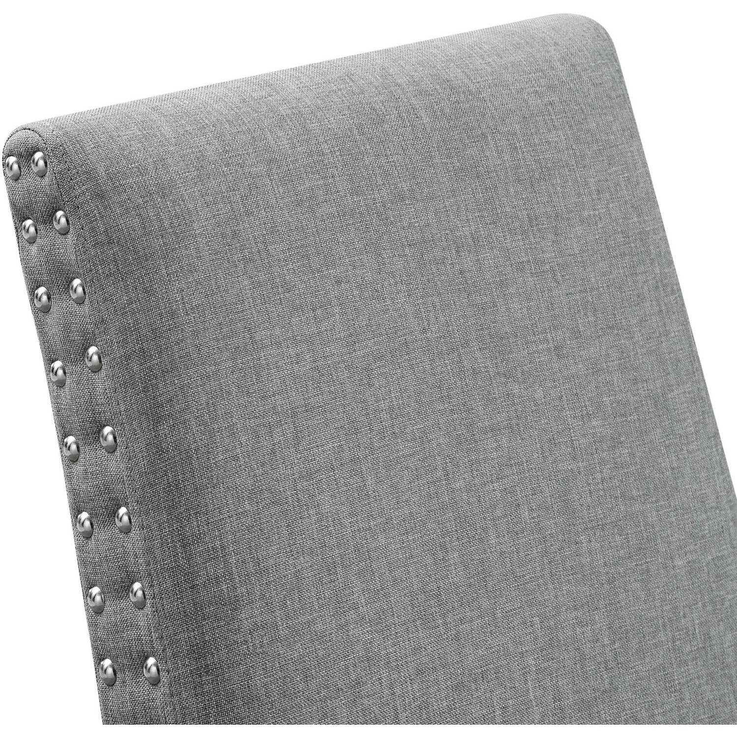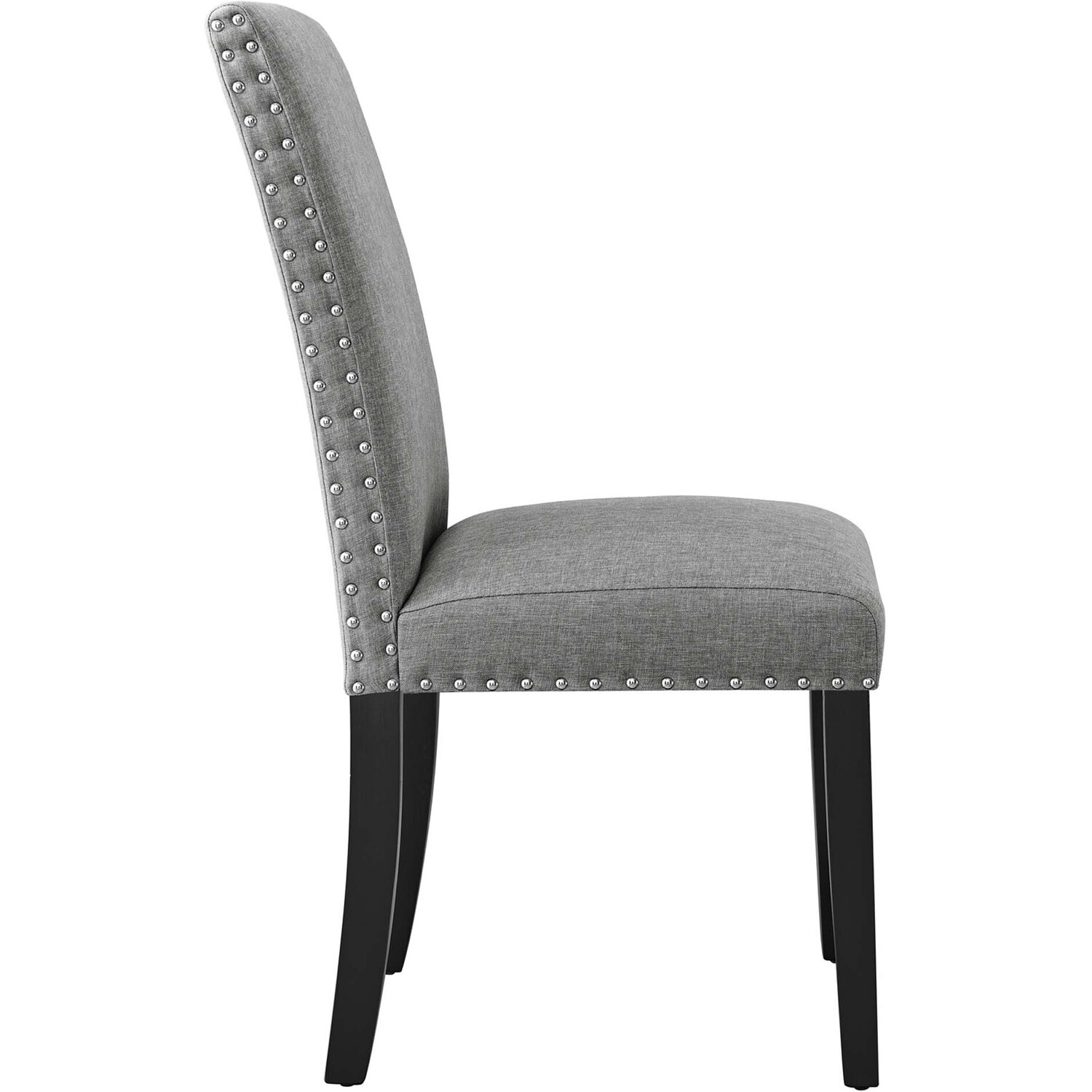 Wrap up moments of quality seating with the Parcel Upholstered Fabric Dining Room Side Chair. Finely upholstered in soft and durable fabric polyester upholstery with elegant nailhead trim, the Parcel Accent Chair delivers a modern offering that enhances the dining room experience. Padded with dense foam and supported by espresso stained tapered wood legs, the Parcel Dining Chair is a stylish addition to your dining room, living room, lounge room, or office. Chair Weight Capacity: 285 lbs. Assembly Required.Modern Accent Chair