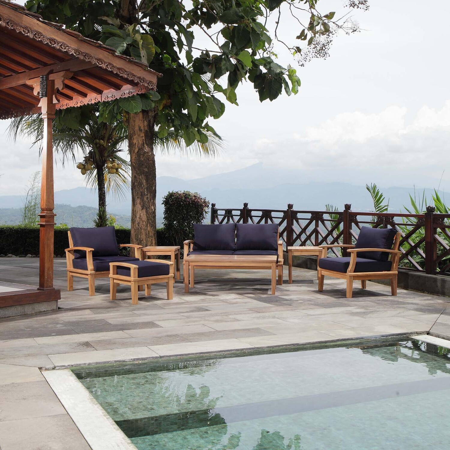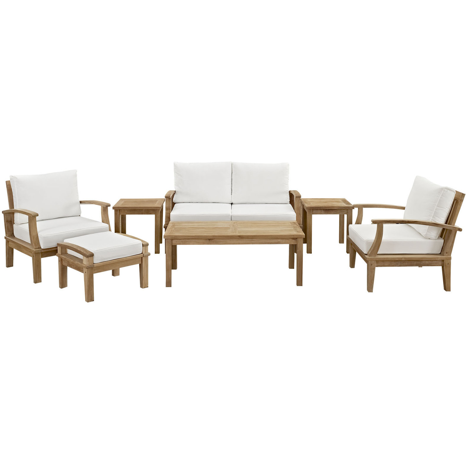 Harbor your greatest expectations with this luxurious solid teak wood outdoor set. Marina has a seating arrangement perfect for every member of your crew as you breathe the fresh, crisp air of a day spent with friends and family. Known for its natural ability to withstand extreme weather conditions, teak is the wood selection of choice for long-lasting outdoor furnishings. Now you can enjoy Marina’s durable construction and all-weather cushions, alongside a modern design that persistently looks new and welcoming. Zoom in on the product image before you, and see the exquisite texture and detail for yourself.Solid teak wood construction