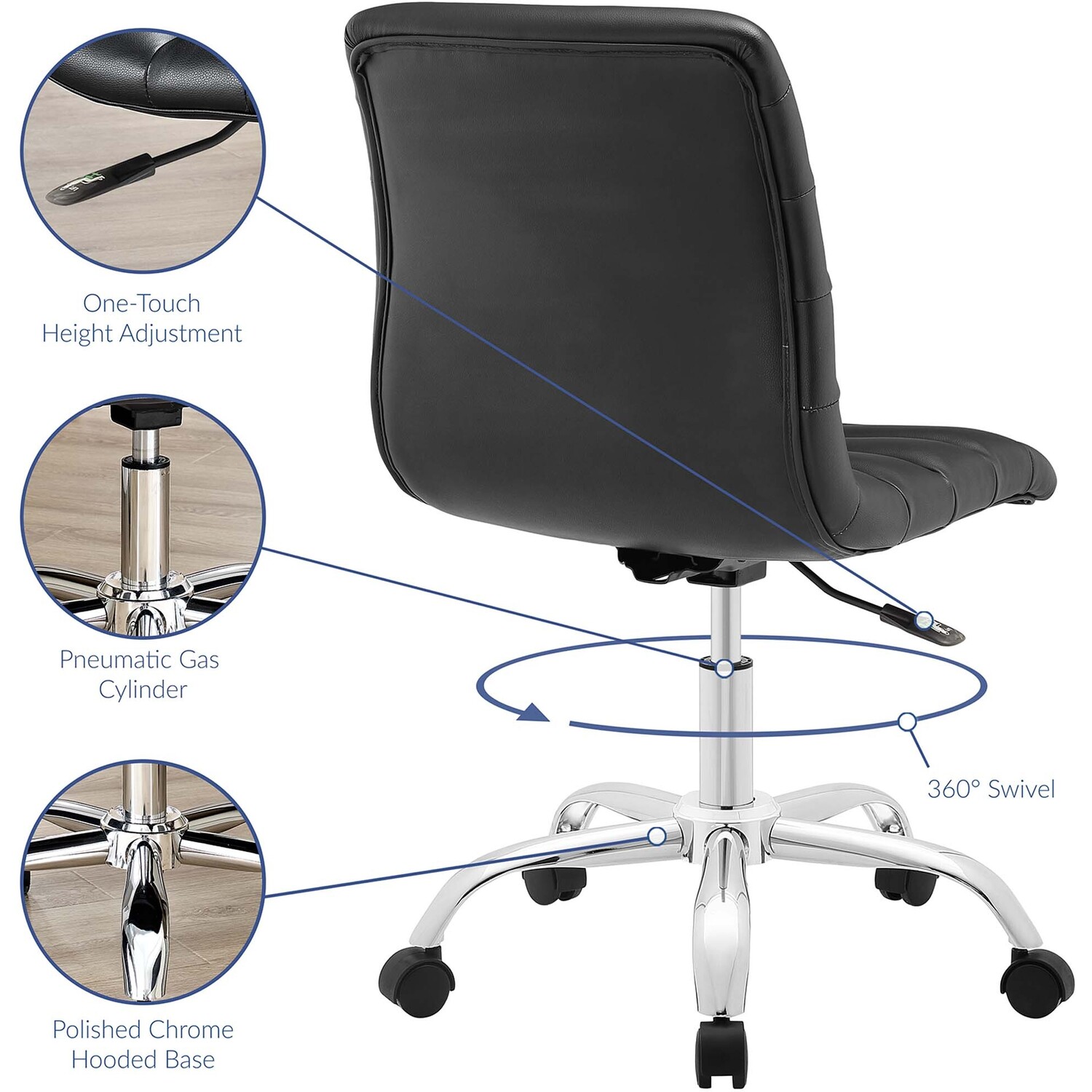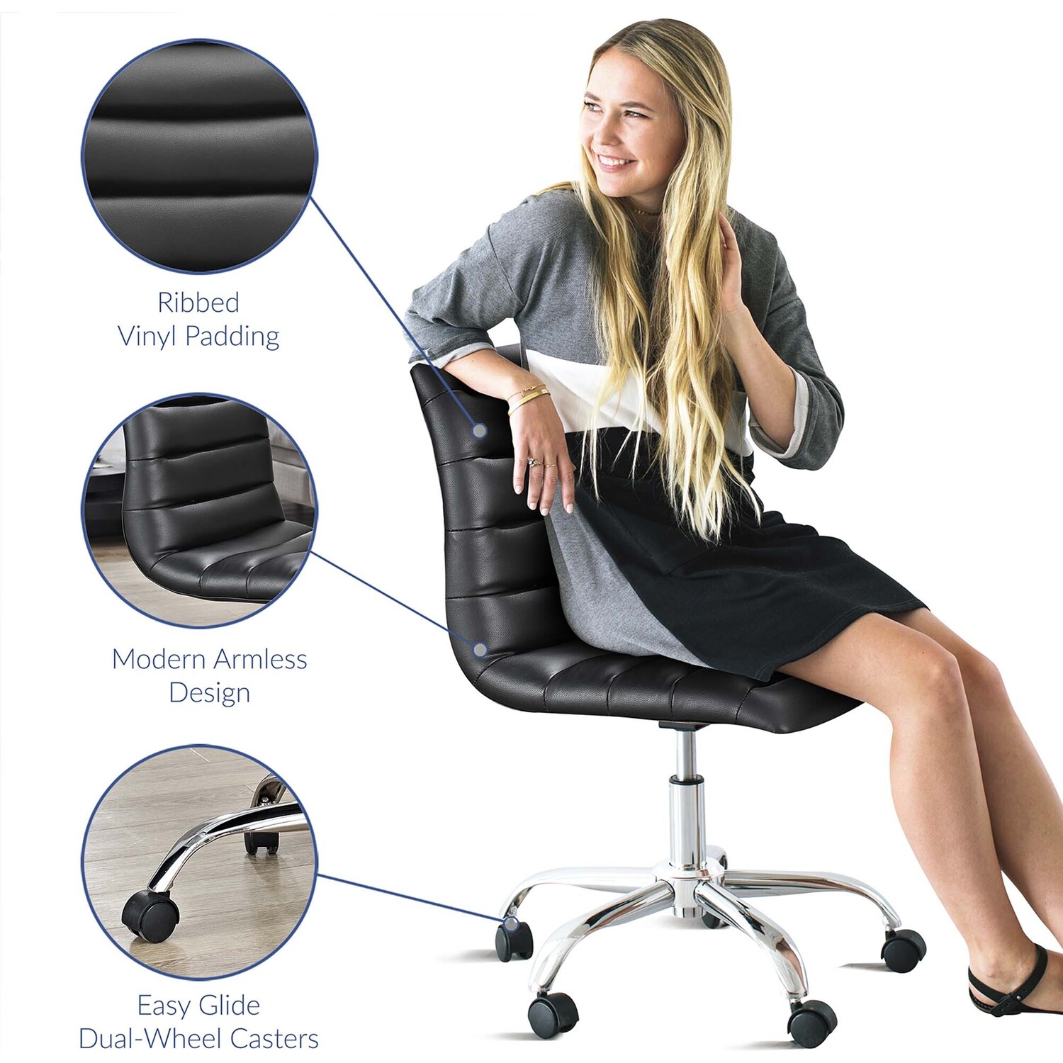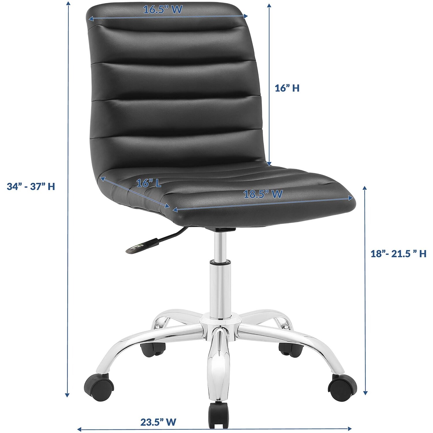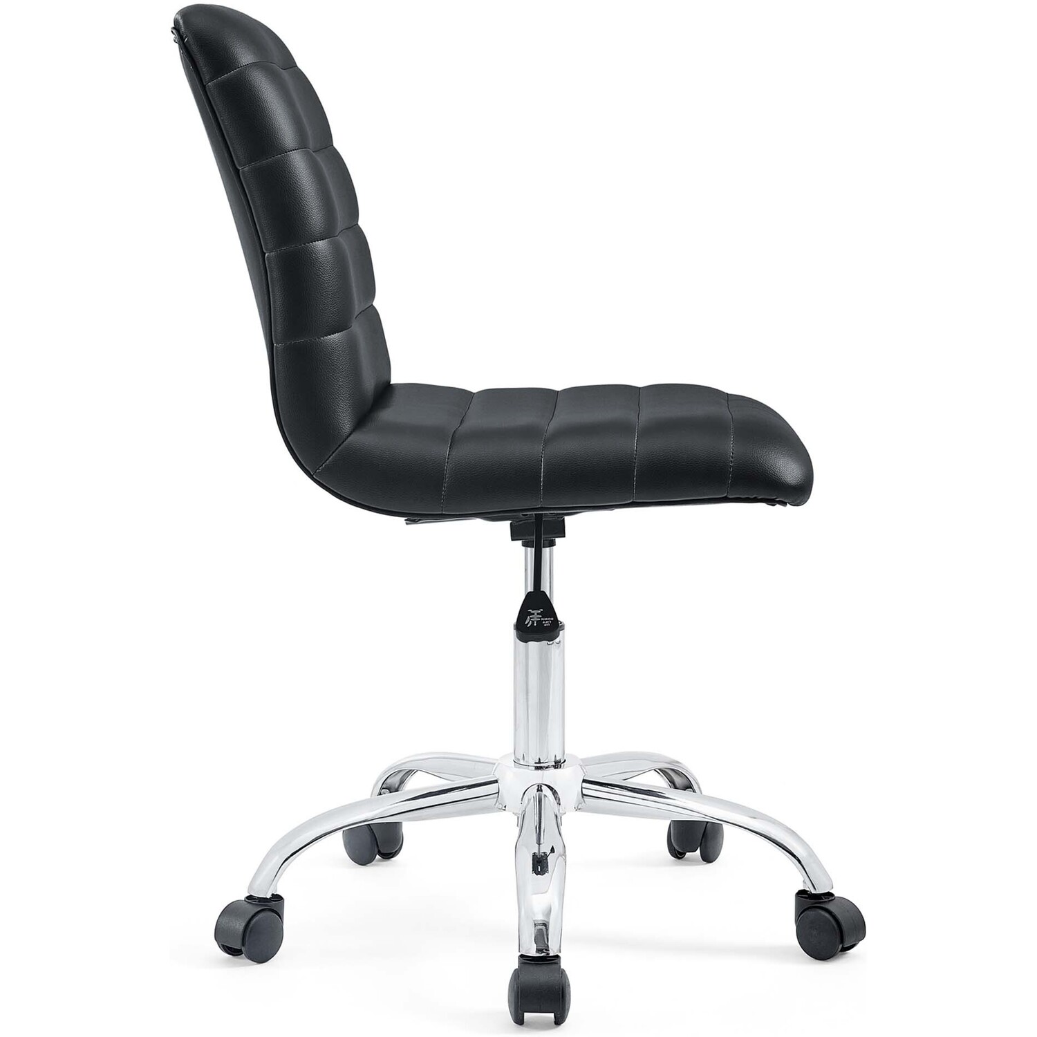 As with the ripple after-effects caused by the toss of a pebble, there’s no telling where the Ripple armless office chair will take you. For those who appreciate natural resolve, without the need to know the destination point, then Ripple is for you. Outfitted with a polished chrome steel frame and five dual-wheel casters for easy mobility over hardwood or carpeted surfaces, the padded vinyl Ripple armless office chair begins and ends with innovation. Ripple is perfect for conference rooms and workstations, features fine stitching and trim throughout, and comes fully height adjustable with a 360-degree swivel.Modern armless midback office chair