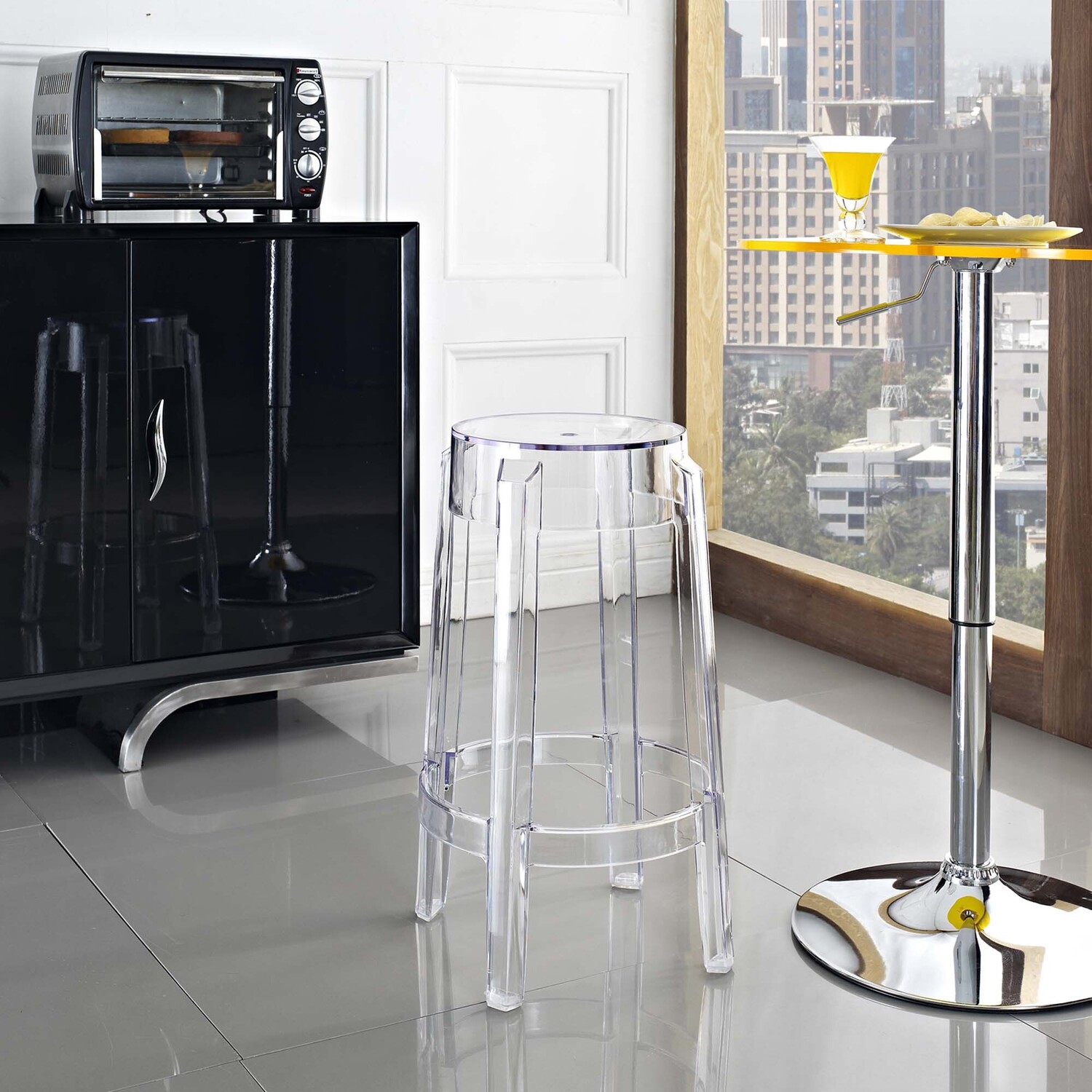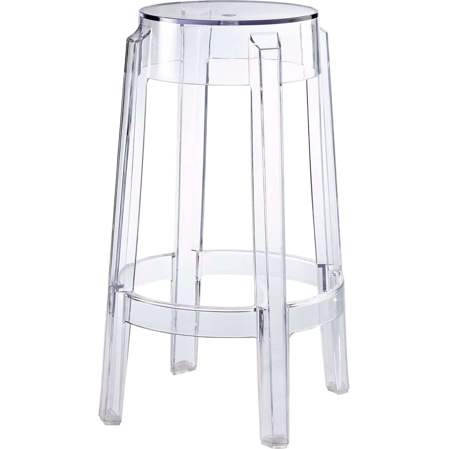 The silhouette-inspired design of this counter stool is a sure attention grabber that coordinates with any color scheme. Constructed from transparent acrylic, this stunner includes non-marking feet that both help protects sensitive floors and stabilize the stool.Transparent Polycarbonate Construction