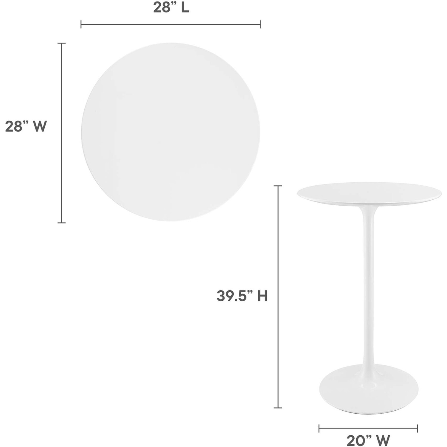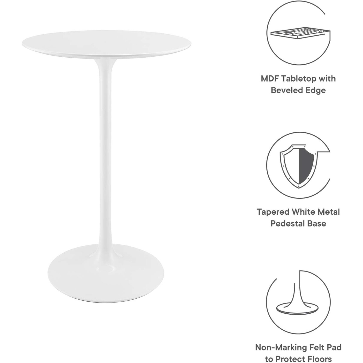 Let modern inspiration flow while gathered around the Lippa 28" Round Bar Table. Perfect for entertaining family and friends or everyday dining, this pedestal table comfortably seats two. Its round tabletop is crafted with MDF with a high gloss finish and beveled edge for a contemporary yet timeless design. Embodying an iconic mid-century silhouette, this pedestal bar-height table floats on a sleek tapered metal pedestal base with a chip-resistant lacquered finish. Includes non-marking felt pad to protect flooring. Assembly required.Modern Bar Table