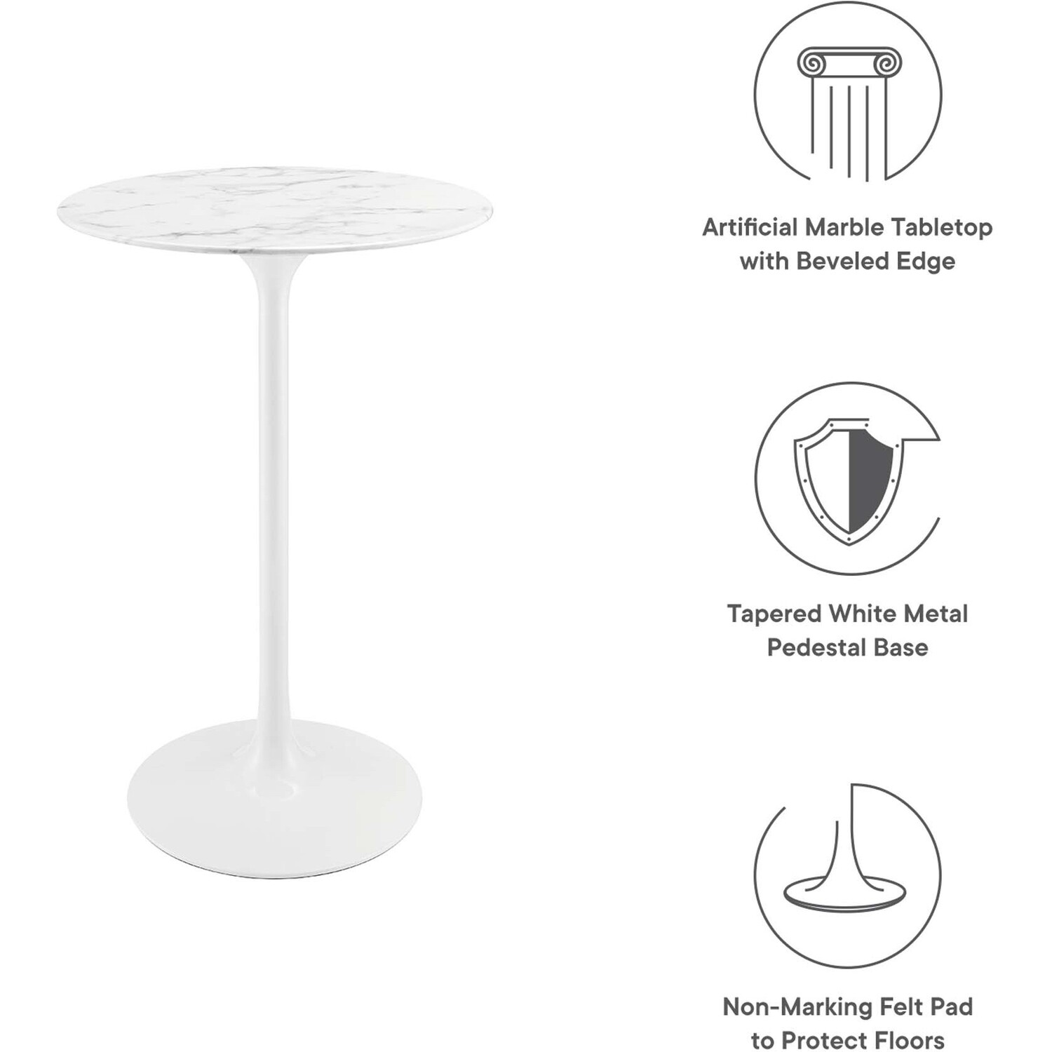 Let modern inspiration flow while gathered around the Lippa 28" Round Artificial Marble Bar Table. Perfect for entertaining family and friends or everyday dining, this pedestal bar table comfortably seats two. Its round tabletop is crafted with artificial marble and features a beveled edge. Embodying an iconic mid-century silhouette, this pedestal bar-height table floats on a sleek tapered metal pedestal base with a chip-resistant lacquered finish. Includes non-marking felt pad to protect flooring. Assembly required.Modern Bar Table