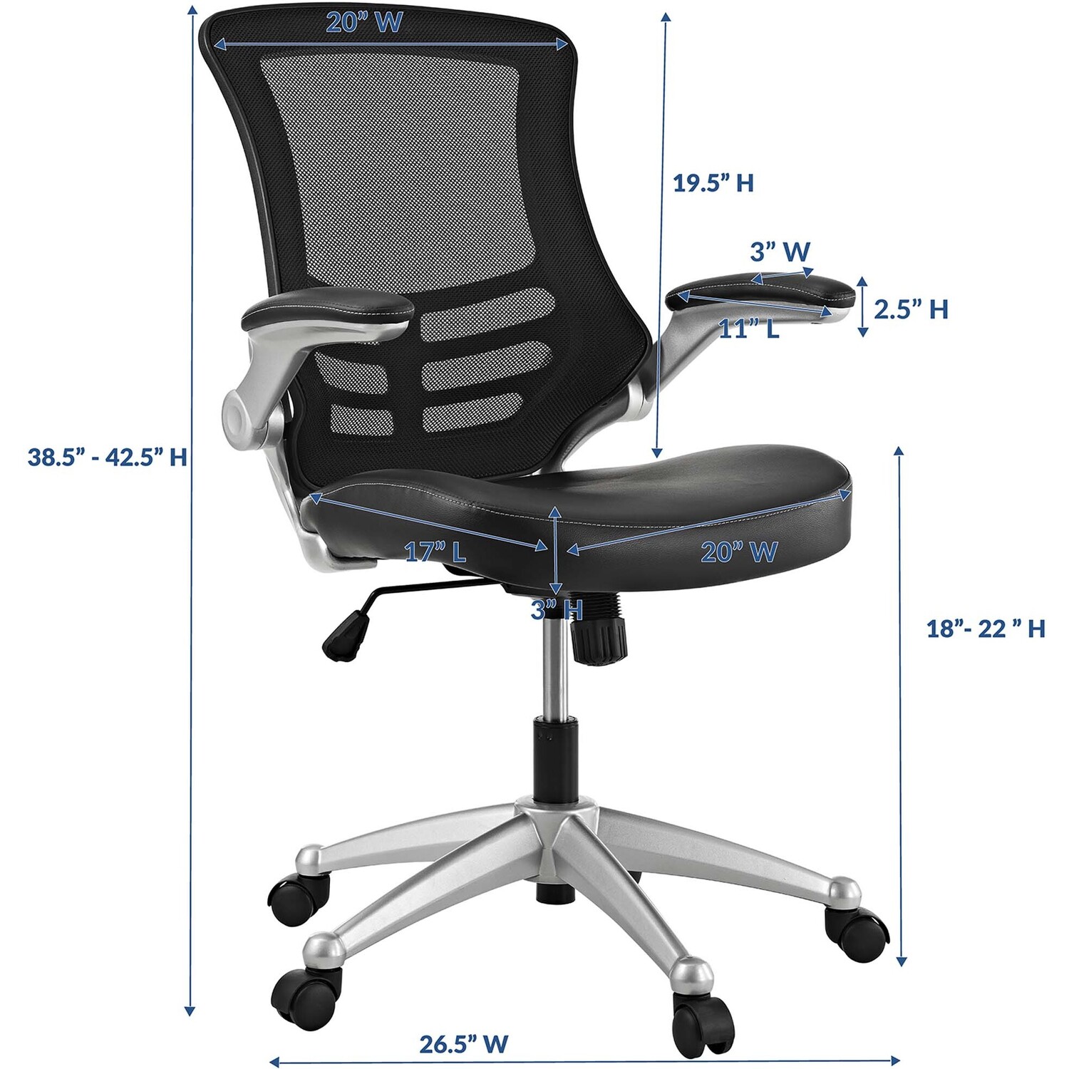 Size: 26.5"L x 26.5"W x 38.5 - 42.5"H Seat Dimensions: 17"L x 20"W x 18 - 22"H Armrest Dimensions: 11"L x 3"W x 2.5"H Backrest Dimensions: 19.5"L x 20"W x 13"H Armrest Height from Seat: 8"H