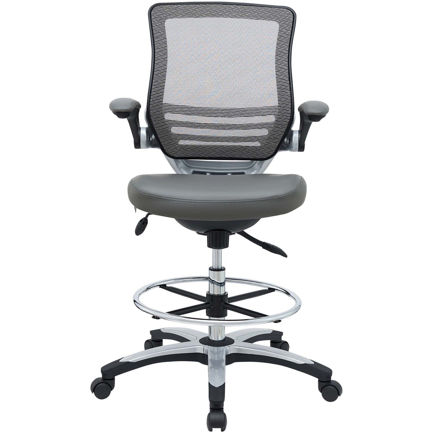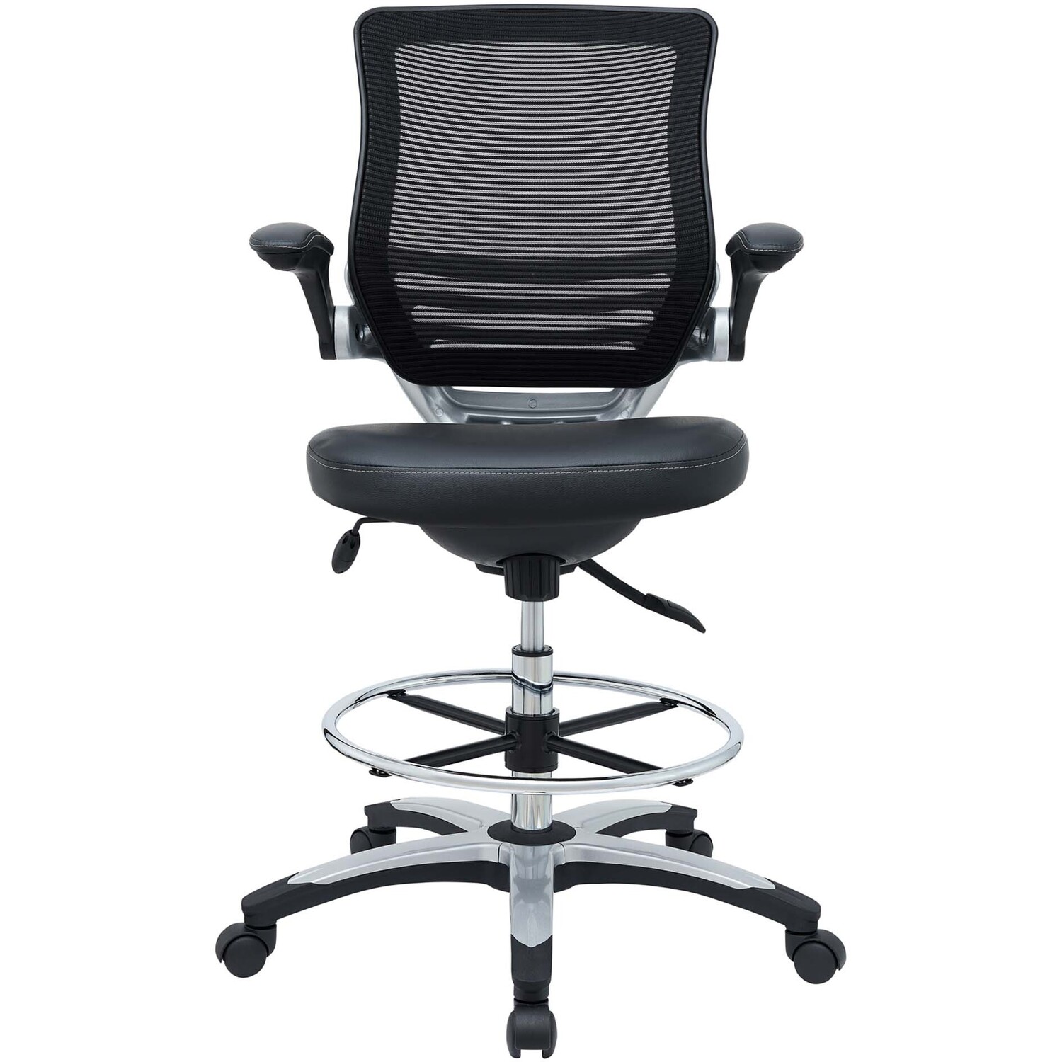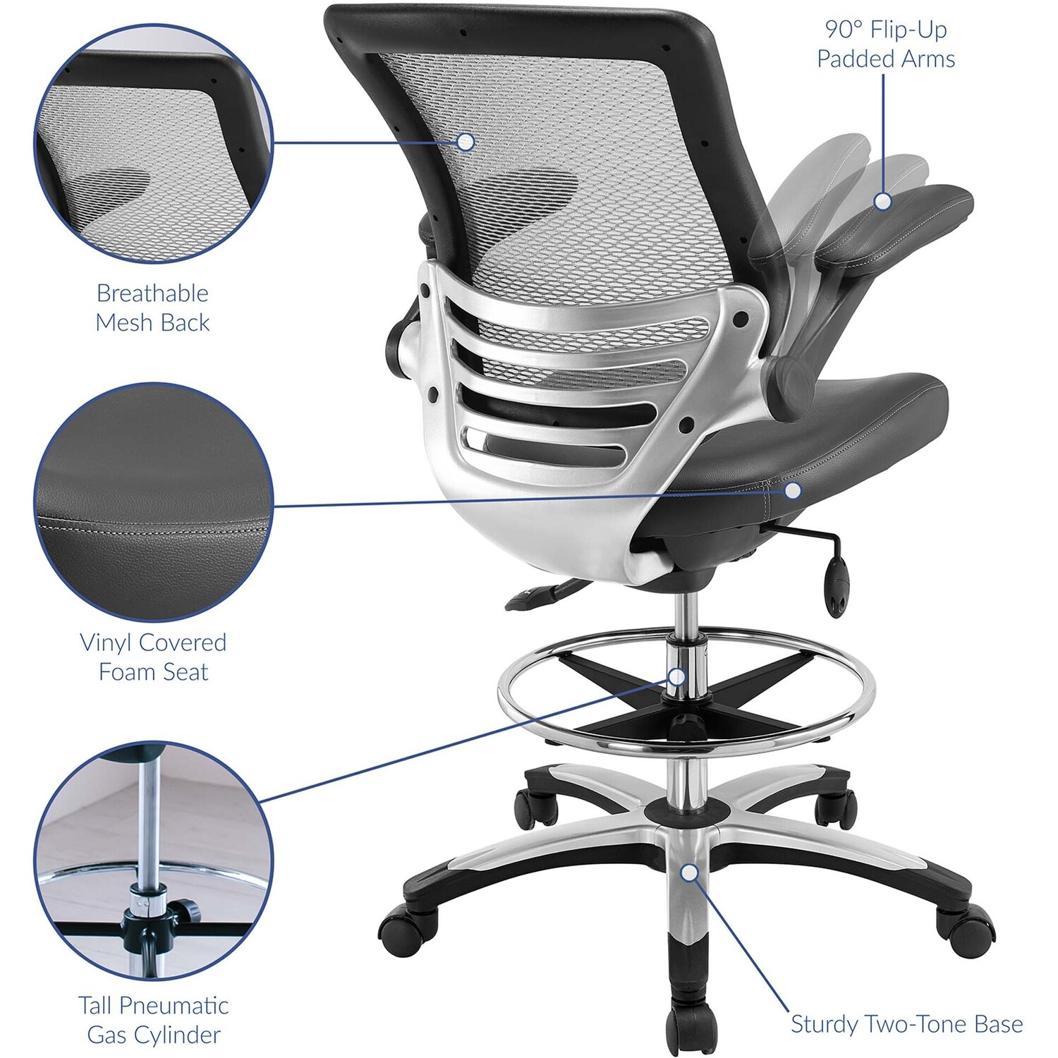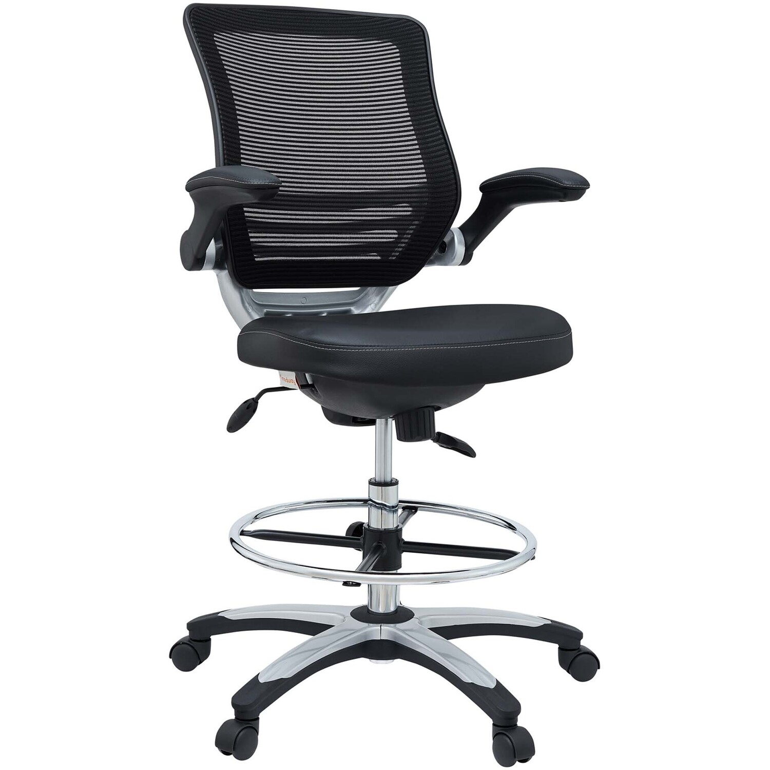 Welcome to a new era in functional comfort. The Edge Drafting Stool implements cutting edge ergonomics to deliver a comprehensive seating experience. Edge features a breathable mesh back for lower back lumbar support, padded waterfall vinyl seat to ease pain and pressure around your thighs, flip-up padded arms, an extra tall gas cylinder with a footring, and it securely locks in place with a user-friendly seat tilt plus tension control knob. Edge is a progressively minded drafting stool perfect for school, work, or home use.90 Degree Flip-Up Padded Arms