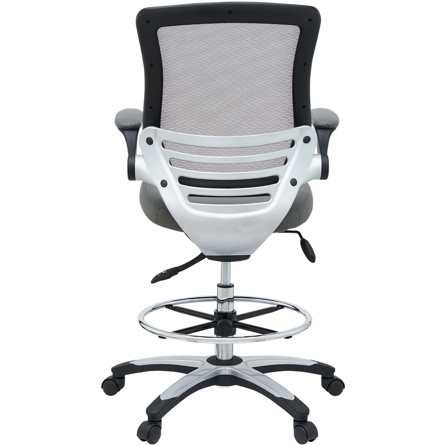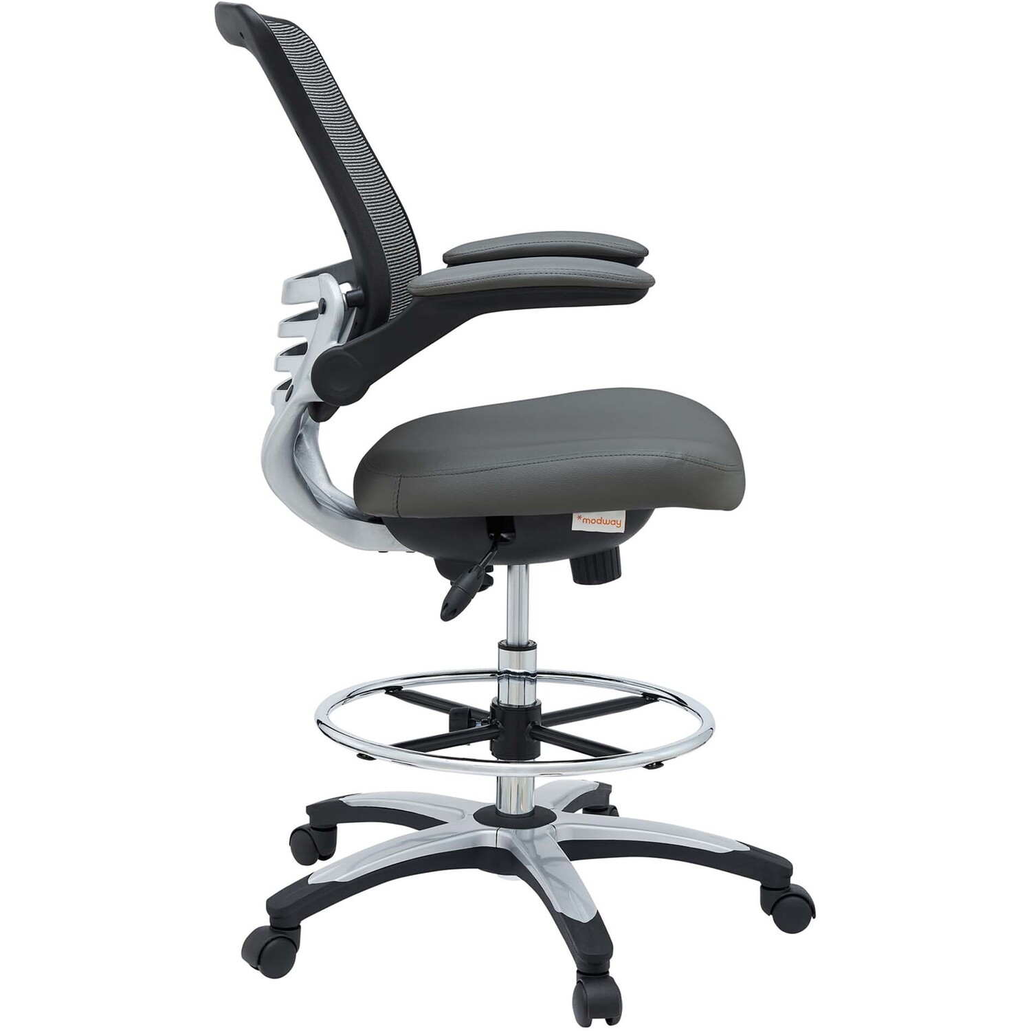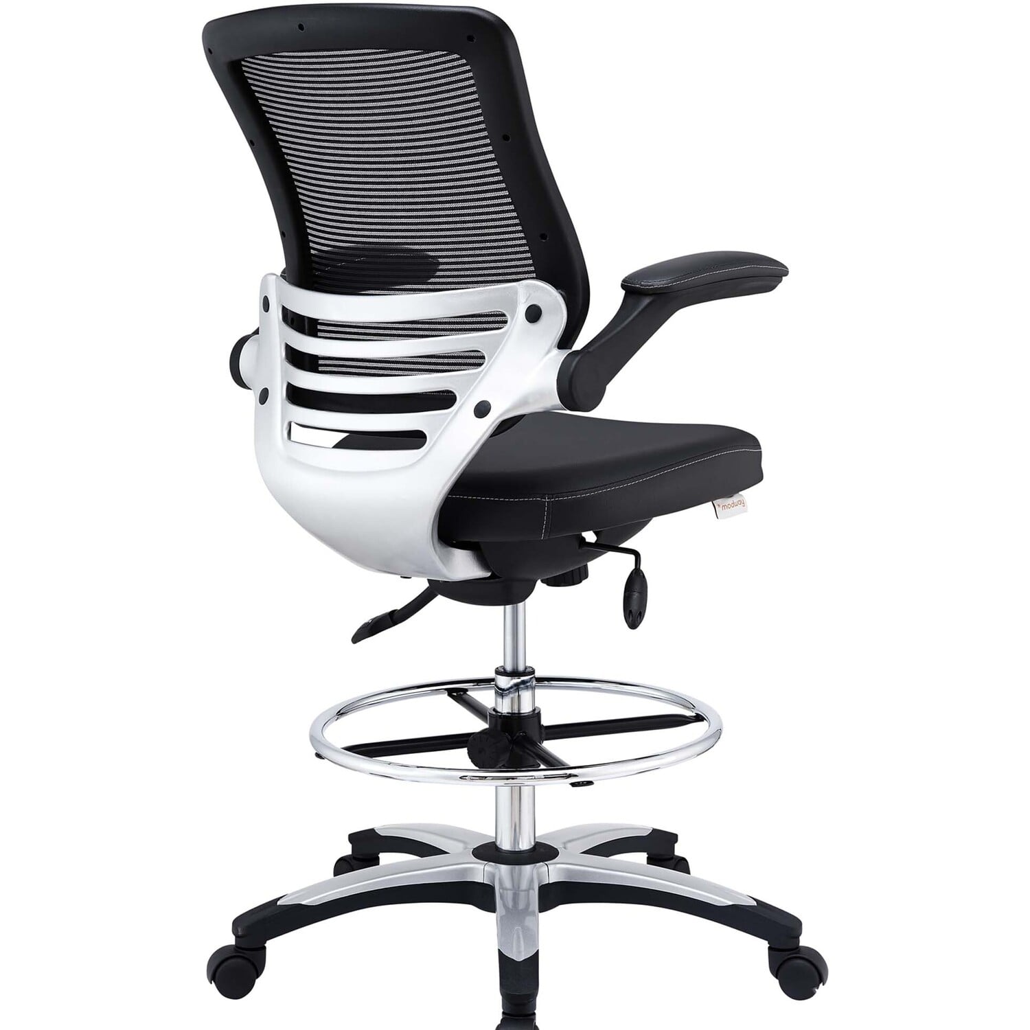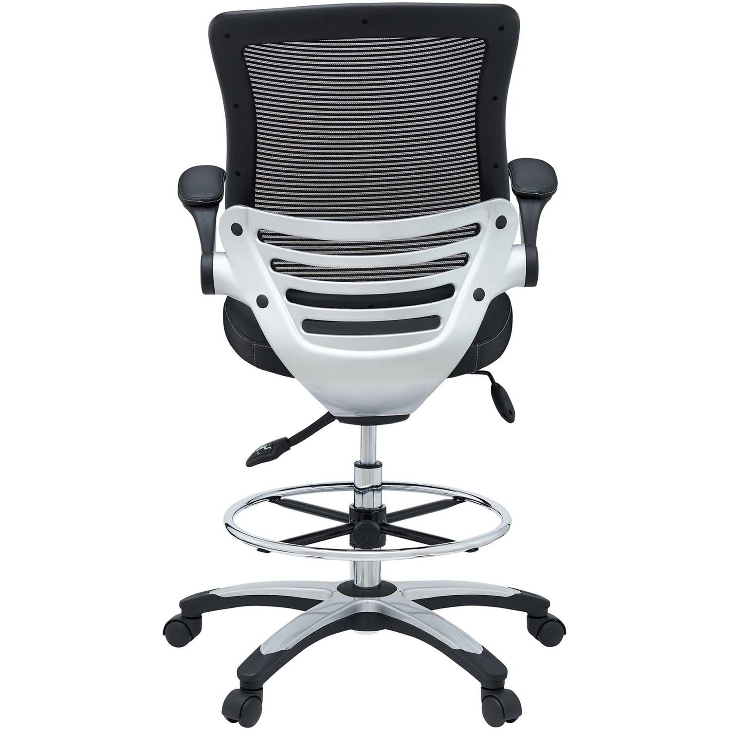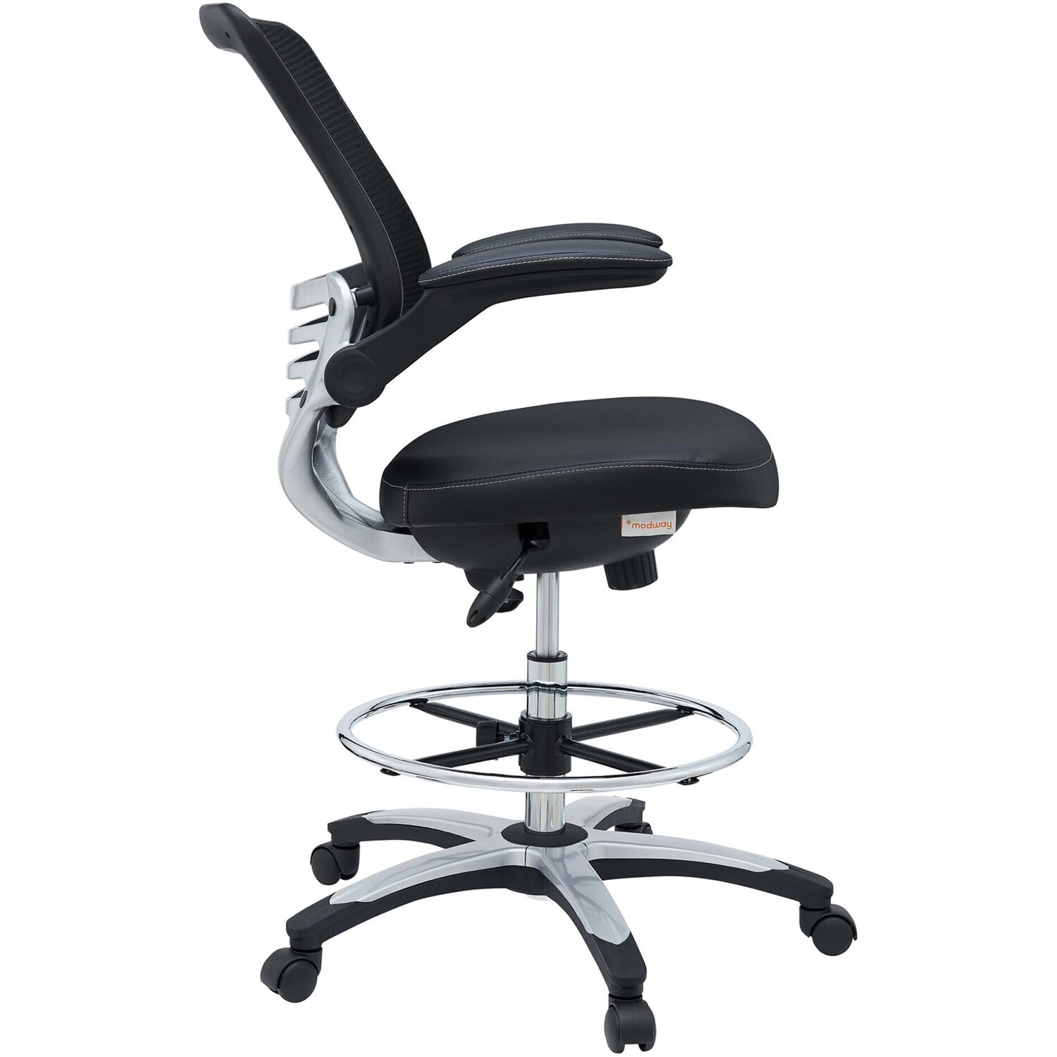 Welcome to a new era in functional comfort. The Edge Drafting Stool implements cutting edge ergonomics to deliver a comprehensive seating experience. Edge features a breathable mesh back for lower back lumbar support, padded waterfall vinyl seat to ease pain and pressure around your thighs, flip-up padded arms, an extra tall gas cylinder with a footring, and it securely locks in place with a user-friendly seat tilt plus tension control knob. Edge is a progressively minded drafting stool perfect for school, work, or home use.90 Degree Flip-Up Padded Arms