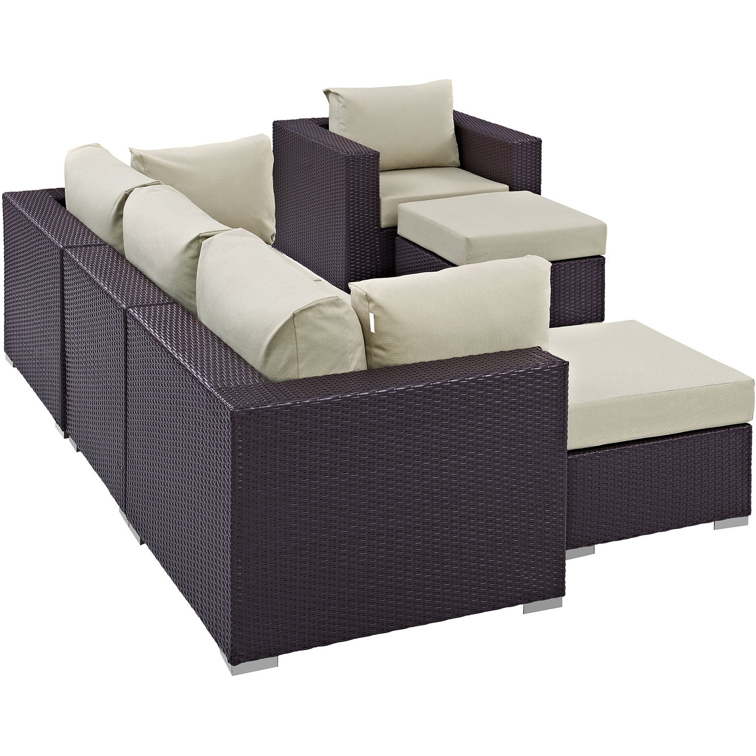 Gather stages of sensitivity with the Convene Outdoor Sectional series. Made with a synthetic rattan weave and a powder-coated aluminum frame, Convene is a versatile outdoor furniture set that shifts and combines according to the spontaneous needs of the moment. Outfitted with all-weather fabric cushions, leave a positive impression on friends and family while enhancing your patio, backyard, or poolside repast in this series of palpable distinction. This installment of the series is an Outdoor Patio Sectional Sofa Set.Synthetic Rattan Weave