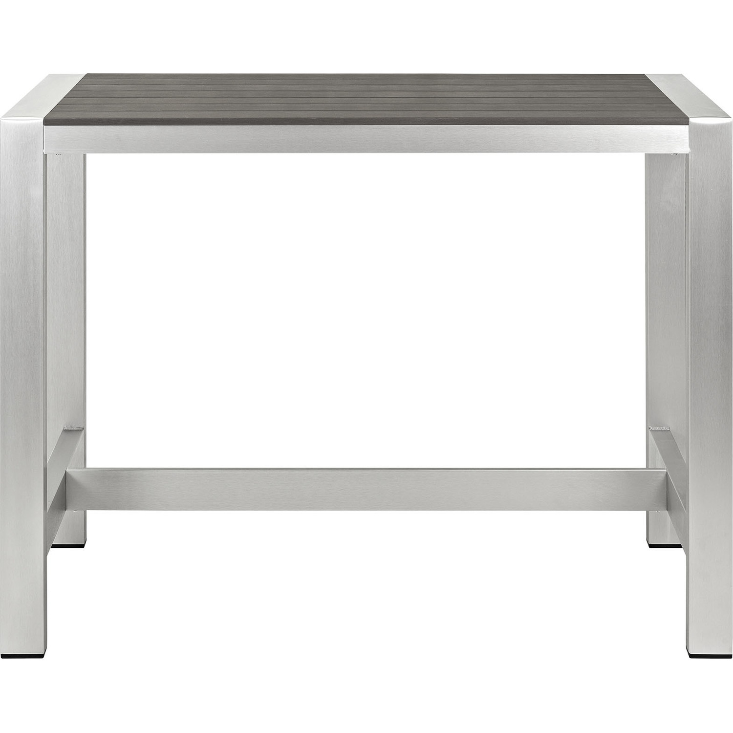 Enjoy your patio or backyard leisure time with the strong and durable Shore Outdoor Patio Bar Table. Made with an anodized brushed aluminum frame and non-marking black plastic foot caps, Shore Patio Bar Table features tone-on-tone grays with wood accents on the paneling for a chic and minimalist look. The Shore Outdoor Aluminum Dining Bar Table complements your casual gatherings with a look and functionality you can rely on.Modern Outdoor Bar Table
