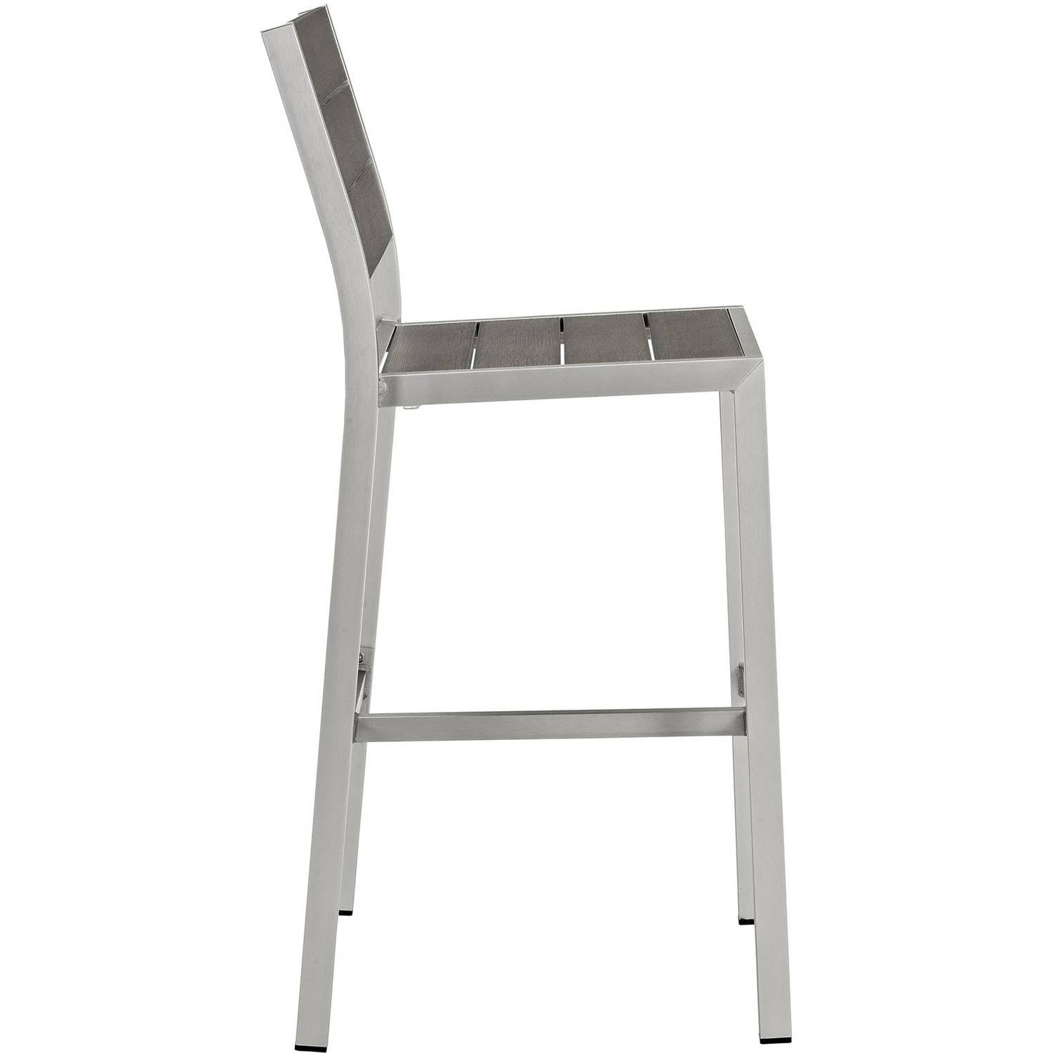 Enjoy your patio or backyard leisure time with the strong and durable Shore Outdoor Patio Armless Bar Stool. Made with an anodized brushed aluminum frame, sturdy footrest, and non-marking black plastic foot caps, Shore Patio Armless Bar Stool features tone-on-tone grays with wood accents on the paneling for a chic and minimalist look. The Shore Outdoor Bar Stool complements your casual gatherings with the versatility you’ve been looking for in a patio bar stool.Modern Outdoor Bar Stool