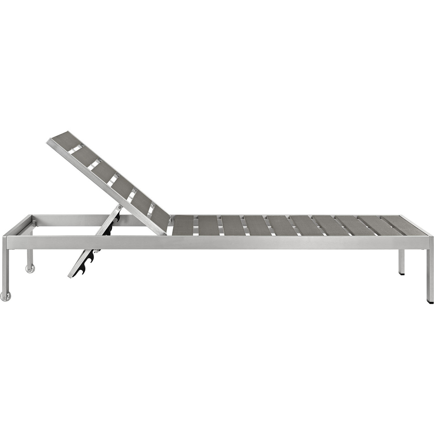 Maintain clean lines with the Shore Outdoor Patio Sun Lounger and Side Table Set. Strong and durable, relax as you choose from four available recline positions or sunbathe while lying flush. Made with an anodized brushed aluminum frame and tone-on-tone grays, Shore Patio Chaise Lounge and Side Table set is a breeze to assemble, comes with clear wheels for easy mobility on the top end, and non-marking black plastic foot caps under the bottom two support legs. Chic and minimalist, the Shore Outdoor Chaise Lounge and Side Table set is a piece built to last with the comfort and versatility you’ve been looking for in an outdoor sunbathing area.Outdoor Sun Lounger/Chaise/Side Table