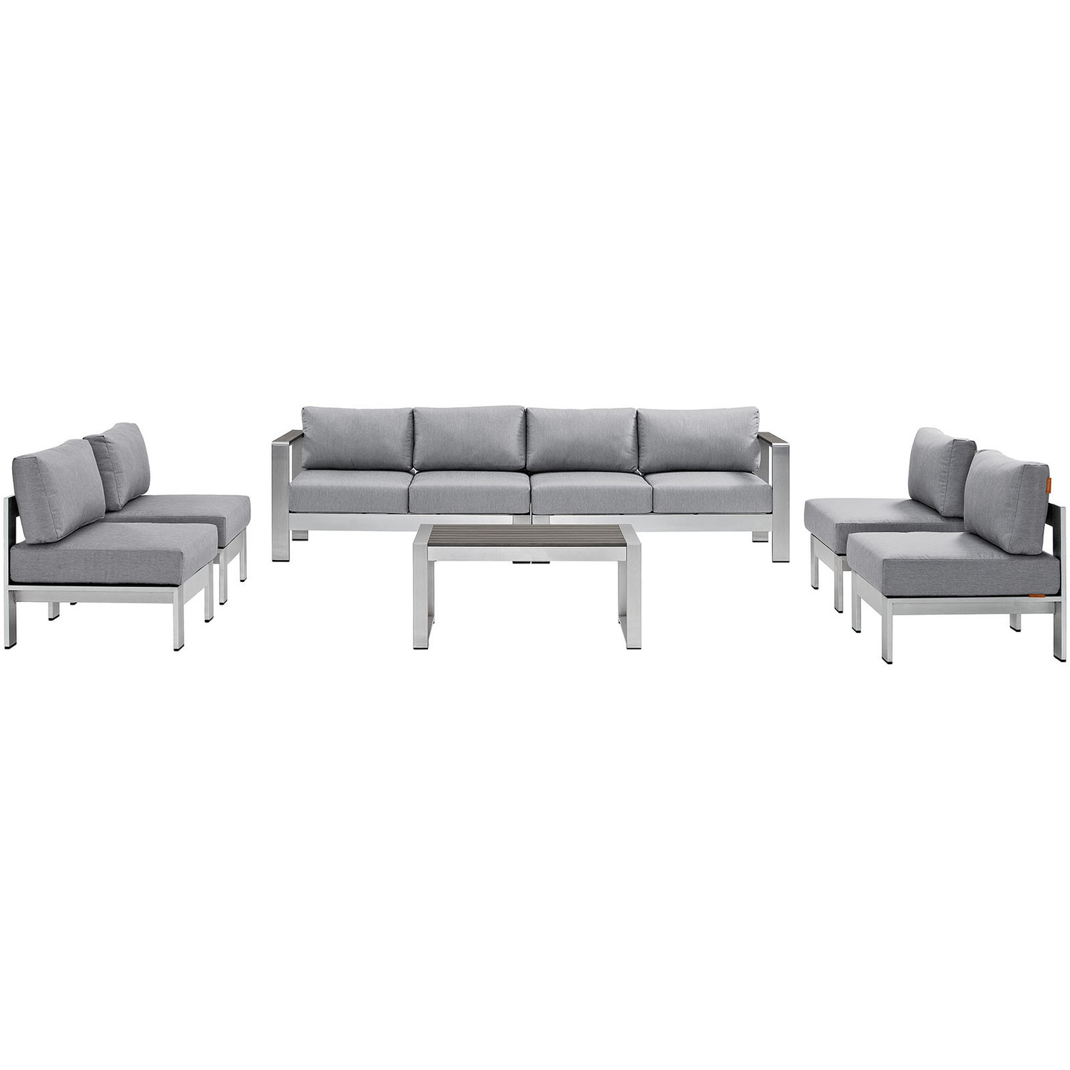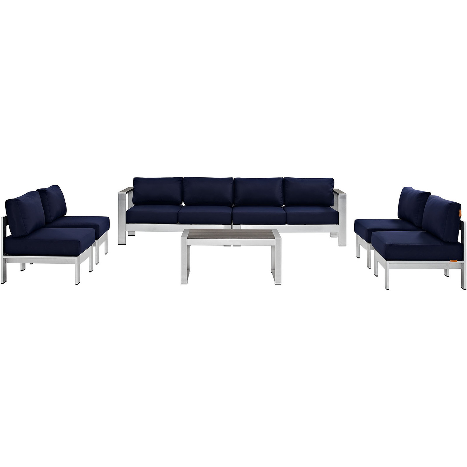 Enjoy your patio or backyard leisure time with the strong and durable Shore Outdoor Patio Collection. Made of anodized brushed aluminum frames and non-marking black plastic foot caps, Shore Outdoor Sectional Sofa pieces come outfitted with resilient fabric canvas tested to last through all weather conditions. The Shore Outdoor Patio Sectional Furniture Set complements casual gatherings with a chic look and ready versatility you can rely on.Modern Outdoor Patio Collection