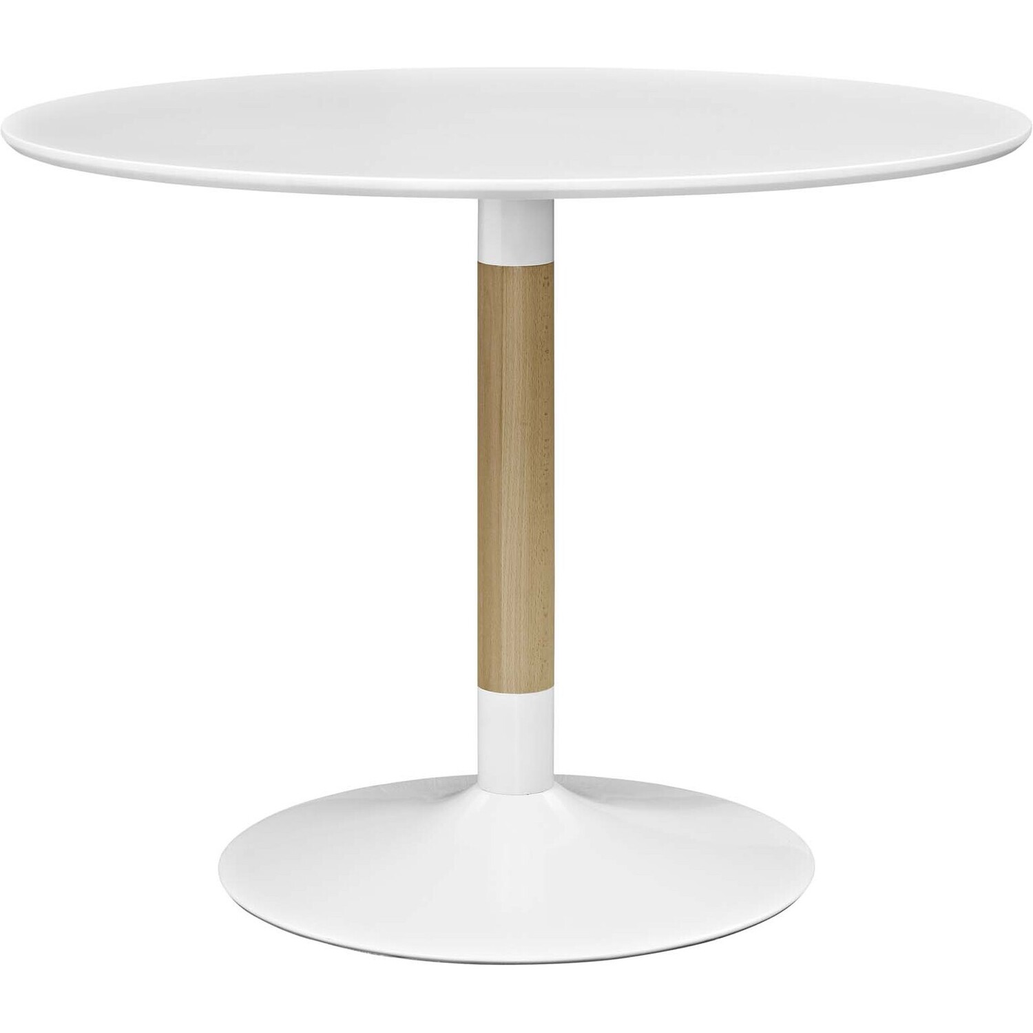 Experience the connection that draws friends and family together with the Whirl Dining Table. Featuring a harmonizing round top of MDF with a durable matte coating, Whirl comes supported by a solid birchwood central beam and a sturdy steel coated round base outfitted with a pad to help protect your flooring. Leave the world of square tables and clunky legs behind with this clean-lined contemporary piece that easily complements a variety of modern decors.Round Dining Table