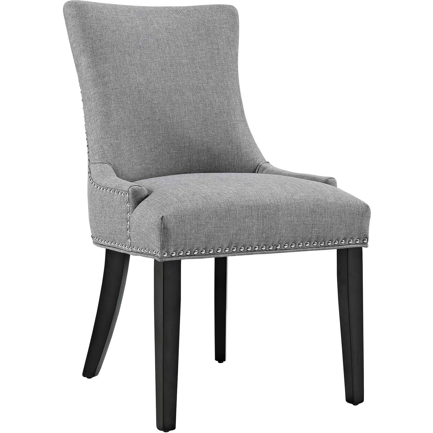 Inspire your décor with the Marquis Dining Side Chair. Marquis is fashioned with a chic hourglass shaped back, studded nailhead trim, non-marking foot caps, tapered wood legs, and a regal seat generously padded in foam and upholstered in polyester fabric. Marquis works well in both modern and traditional dining rooms.Solid Wood Frame