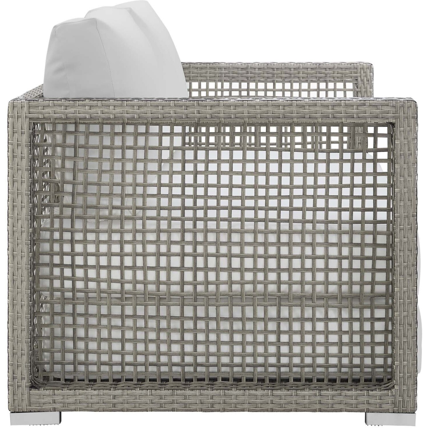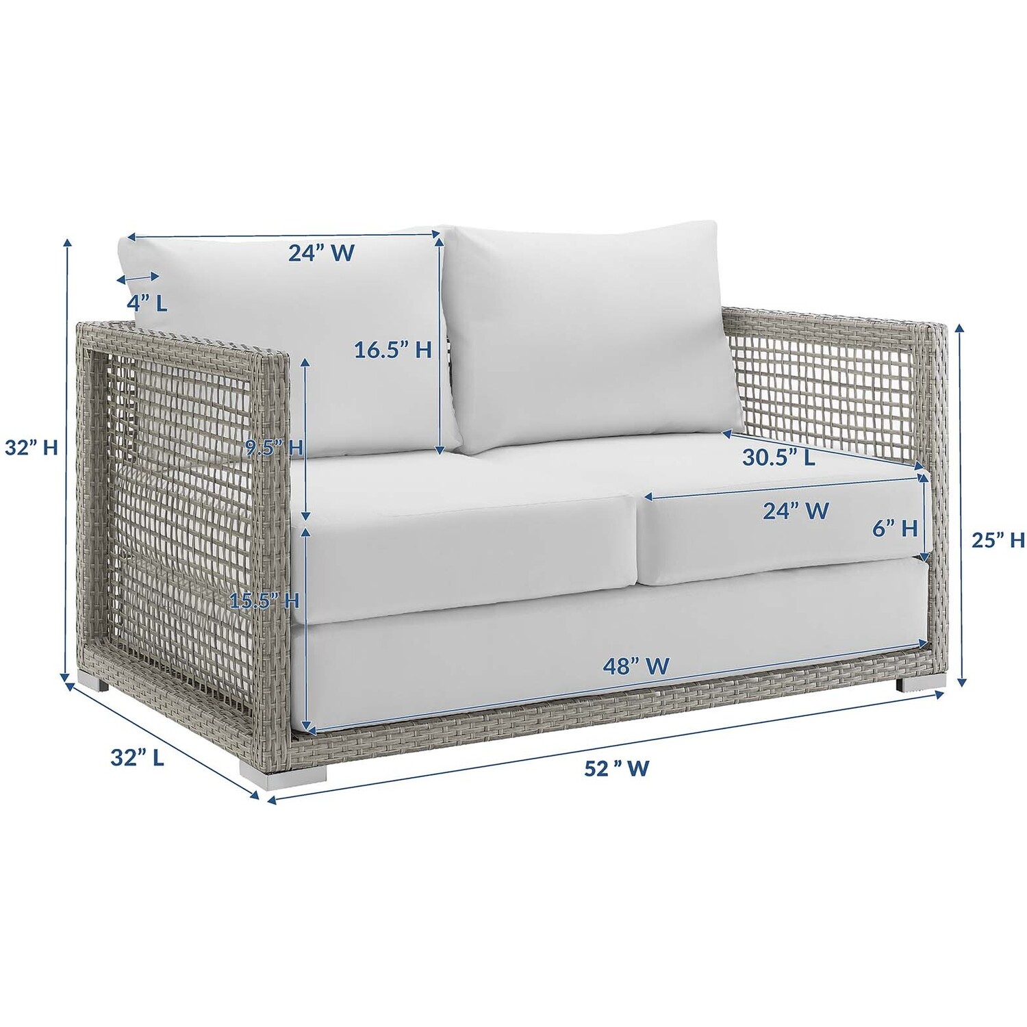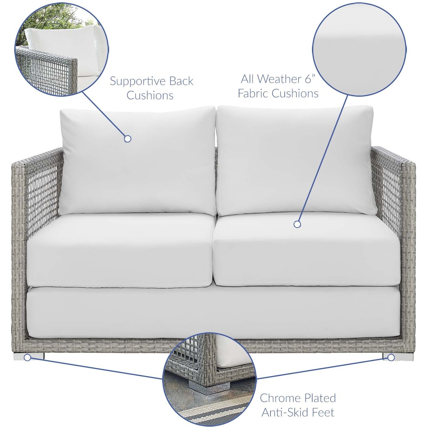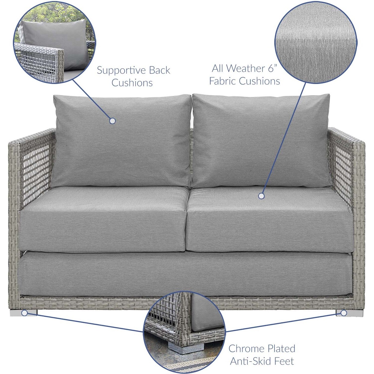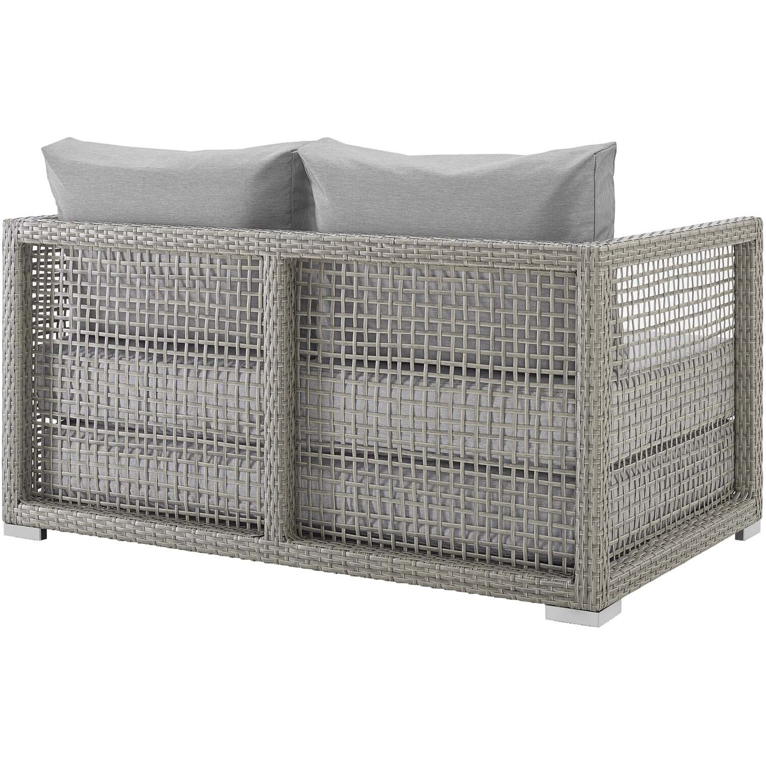 Weave conversational threads into a rollicking good time with Aura Outdoor Patio Loveseat. Aura two-seater couch comes with a synthetic gray-on-gray tone wicker rattan weave and a powder-coated aluminum frame that delivers a softly versatile outdoor collection that shifts to meet the needs of the moment. Outfitted with machine washable and fade resistant all-weather fabric cushions, and designed for immersive seating, Aura is an outdoor loveseat that will make your outdoor spot the focal point of good memories and festive gatherings while enhancing your patio, backyard or poolside arena. Featuring thick cushions and non-marking foot caps, enjoy enhanced comfort with this reliable piece of outdoor furniture. Comes fully assembled.Gray Synthetic PE Wicker Rattan