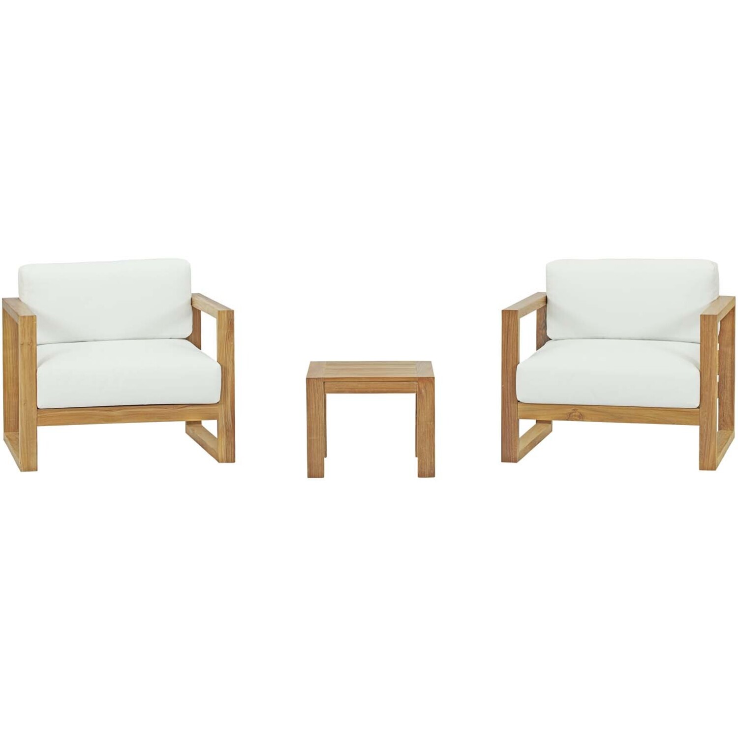 Refresh your outdoor décor with the Upland Teak Outdoor Collection. Boldly designed with eye-catching appeal, Upland is made of solid teak wood with all-weather white cushions and solidly build construction. The perfect choice for balconies, backyards, patios, gazebos, poolside or garden spaces, choose from matching armchair, loveseat, ottoman, side table, coffee table, and chaise lounge selections with this multi-purpose modern teak set. Known for its ability to withstand extreme weather conditions, teak is the wood selection of choice for long-lasting outdoor furnishings. Assembly required.Modern Teak Outdoor Set