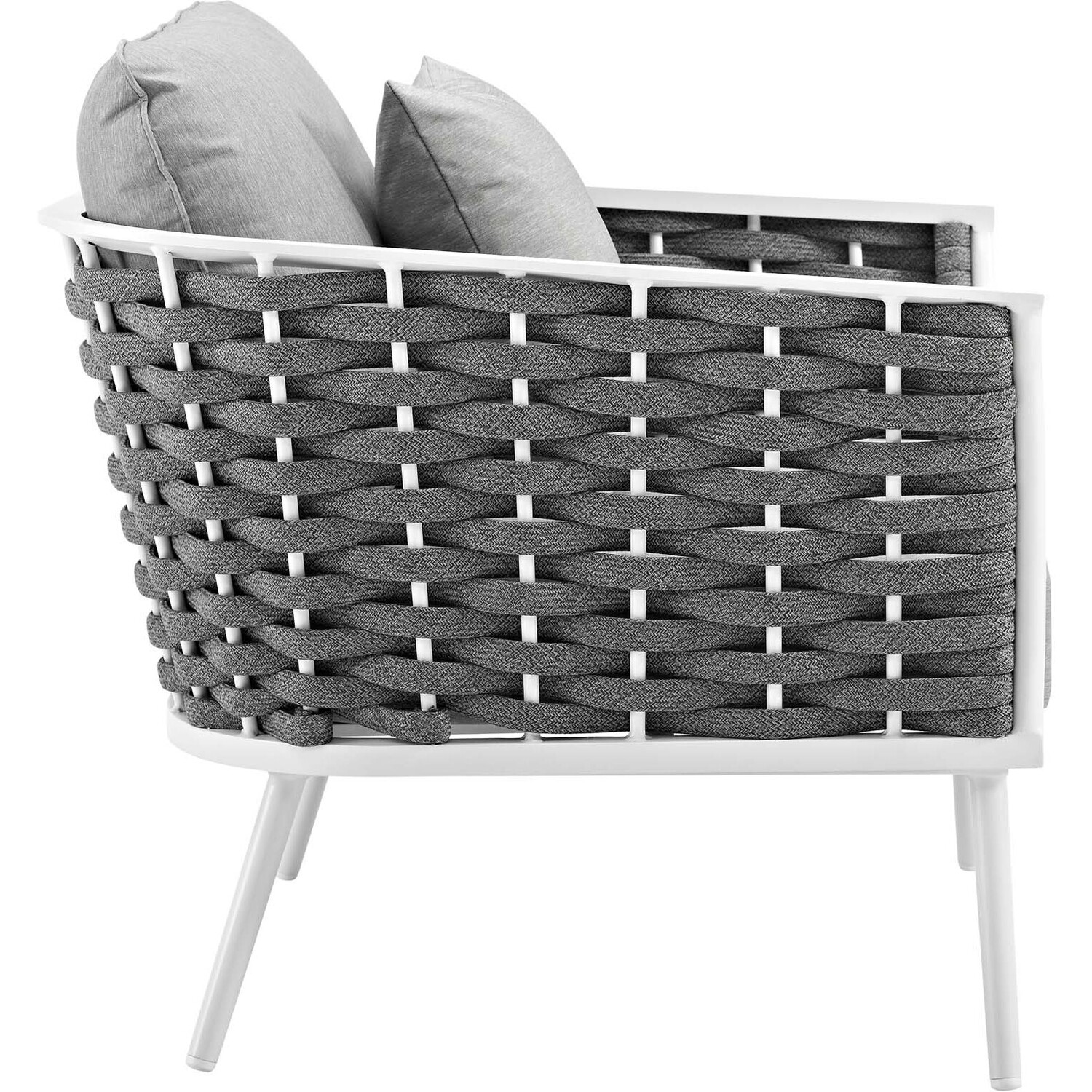 Gather family and friends for pleasant weather and good conversation with the Stance Outdoor Collection. Boasting a contemporary modern look, Stance features woven polyester fabric rope seat back and flared powder-coated aluminum frame, while waterproof all-weather fabric cushions with dense foam padding provide a relaxing spot to lounge. A versatile set designed for long-lasting durability, each piece in the Stance Collection can be mixed and matched and effortlessly arranged to fit the spontaneous needs of you and your guests. Chair Weight Capacity: 331 lbs.Contemporary Outdoor Patio Set