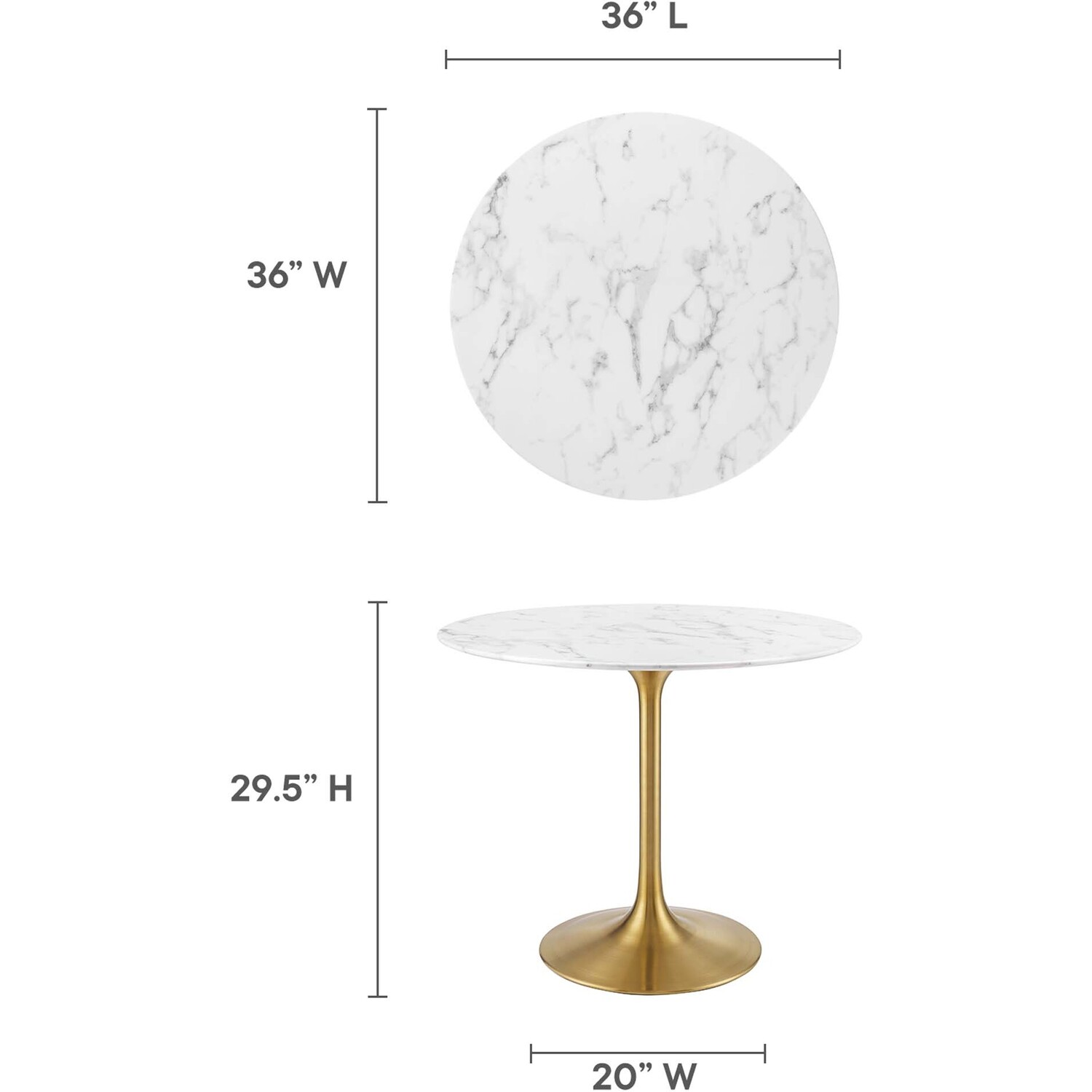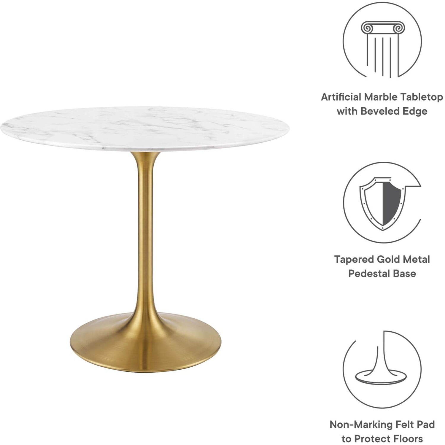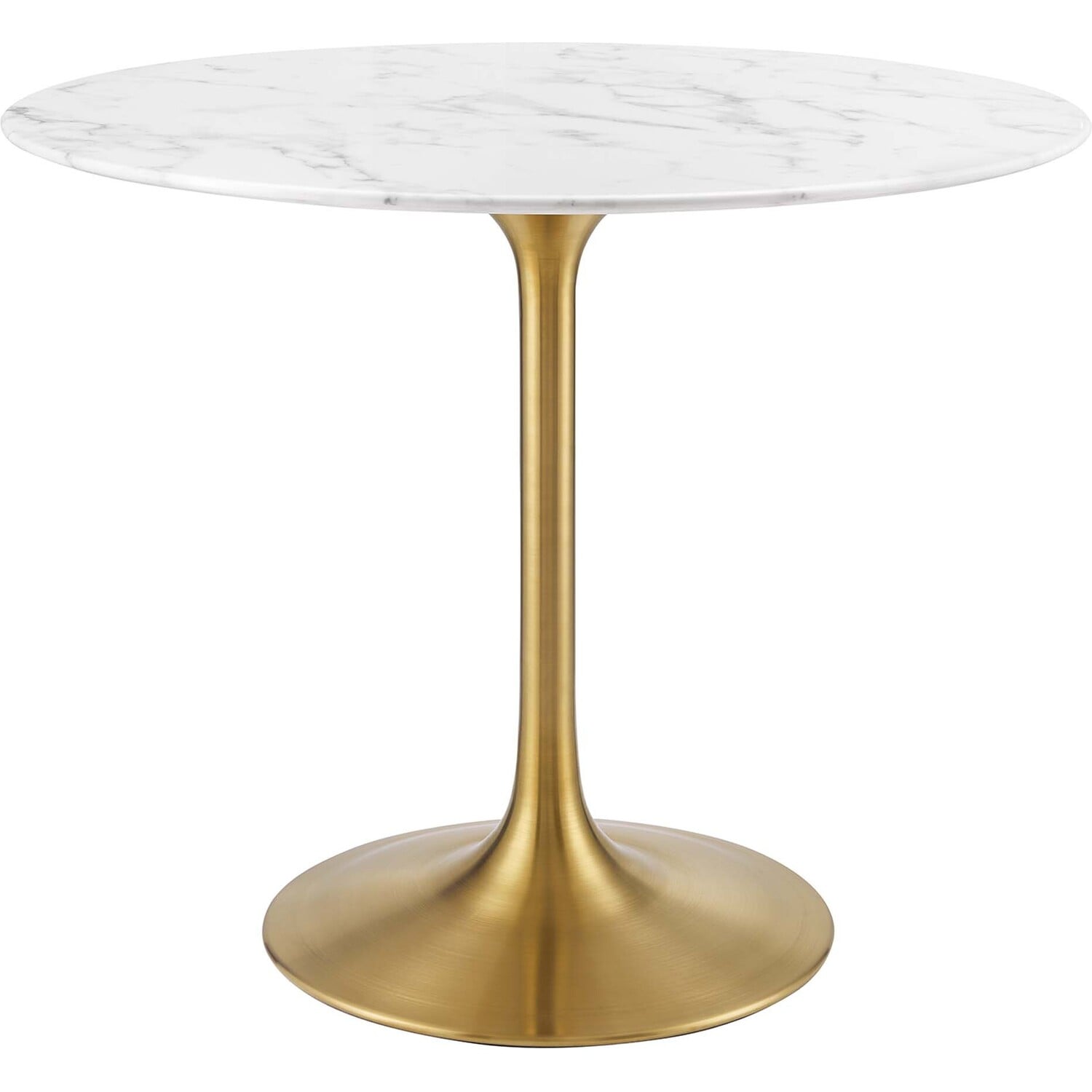 Let modern inspiration flow while gathered around the Lippa 36" Round Artificial Marble Dining Table. Perfect for entertaining family and friends or everyday dining, this pedestal table comfortably seats two. Its round tabletop is crafted with artificial marble and beveled edge for a contemporary yet timeless design. Embodying an iconic mid-century silhouette, this pedestal dining table floats on a sleek tapered metal pedestal base with a chip-resistant brushed gold finish. Includes non-marking felt pad to protect flooring. Assembly required.Modern Dining Table