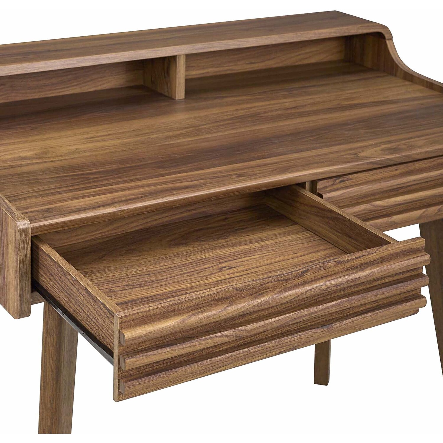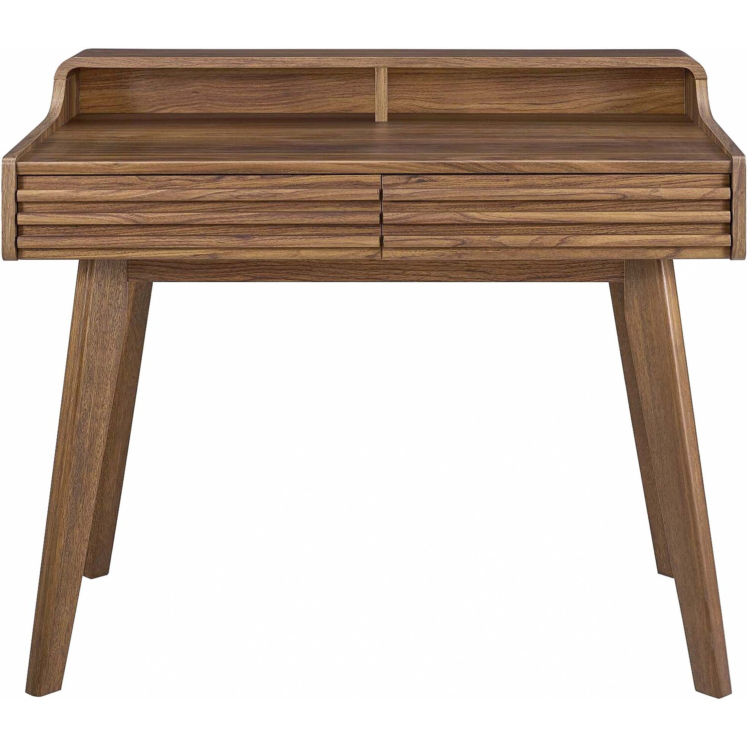 Tap into mid-century aesthetics with the Render Writing Desk. This living room or bedroom computer or writing desk features a durable particleboard frame with smooth walnut grain laminate, four tapered wood legs, and two full-extension glide storage drawers. Boasting a mid-century modern style this computer desk features a solid construction with a pleasing look and practical functionality. Perfect for the apartment or dorm.Mid-Century Writing Desk
