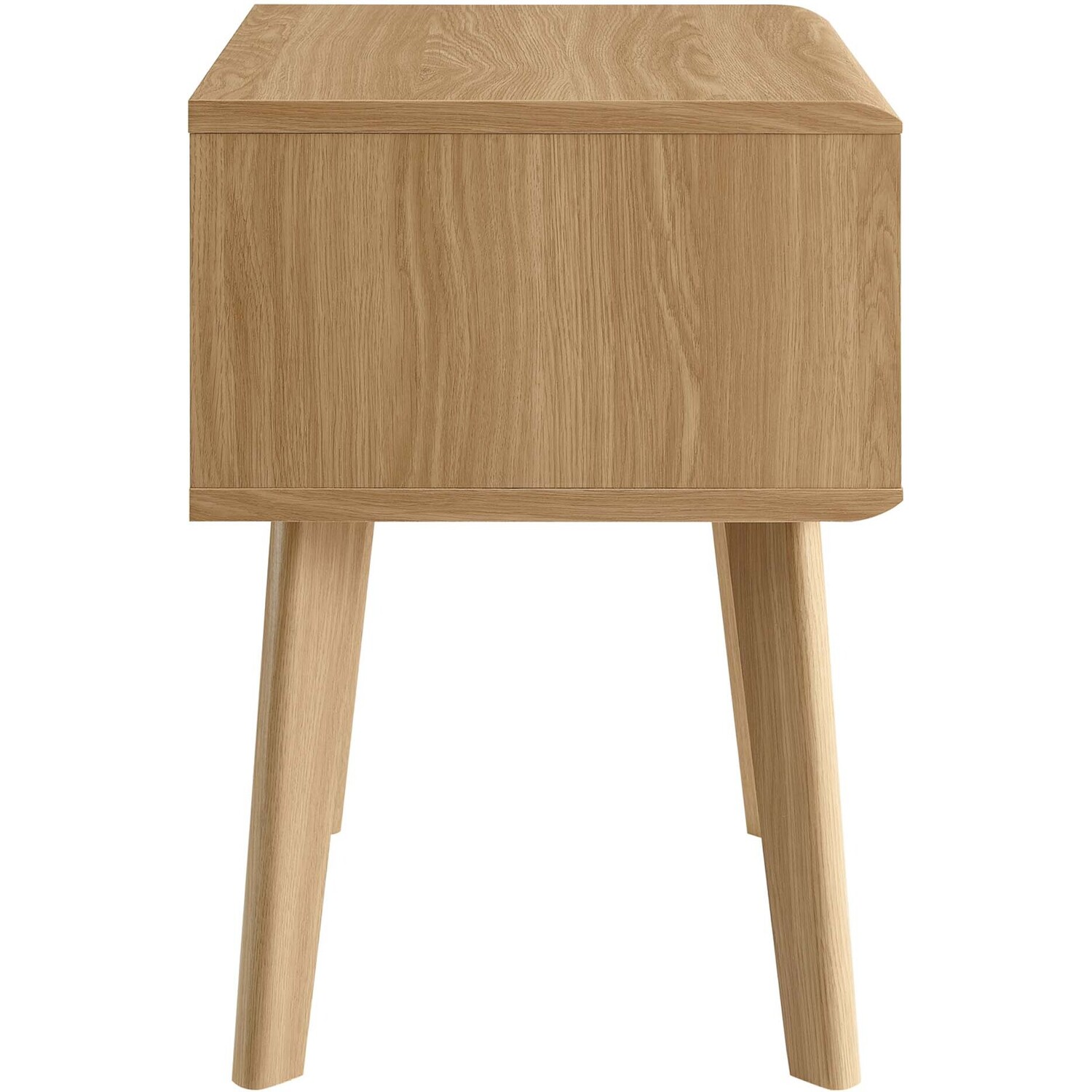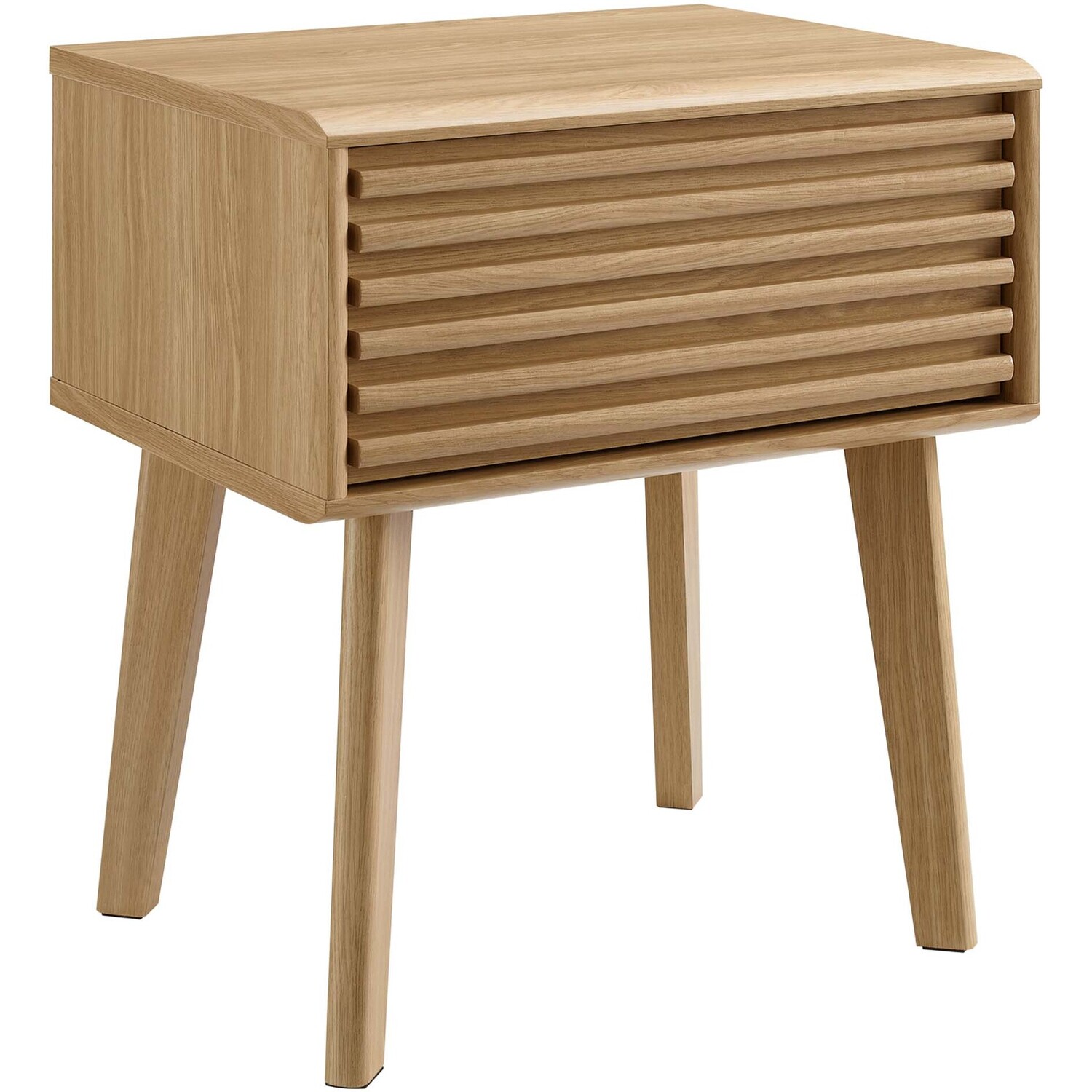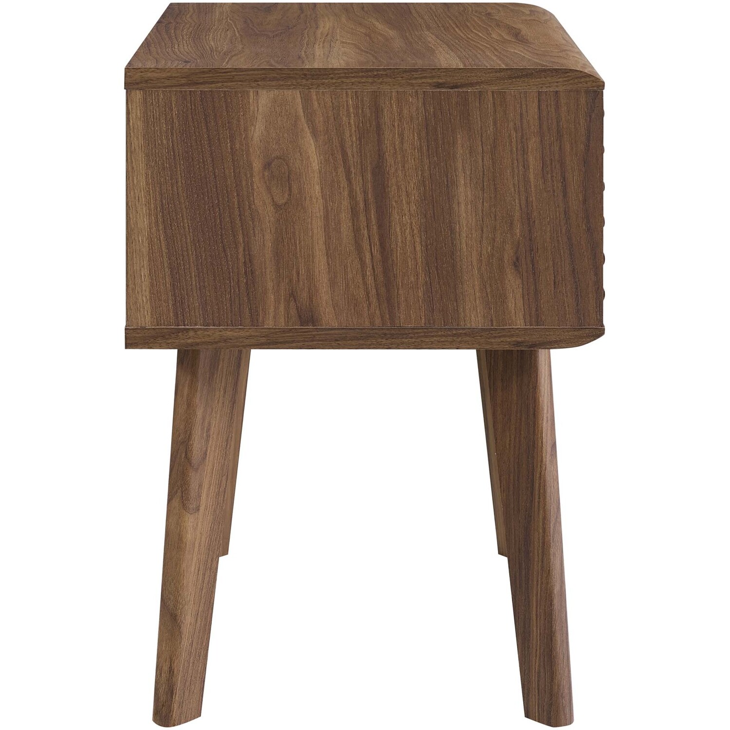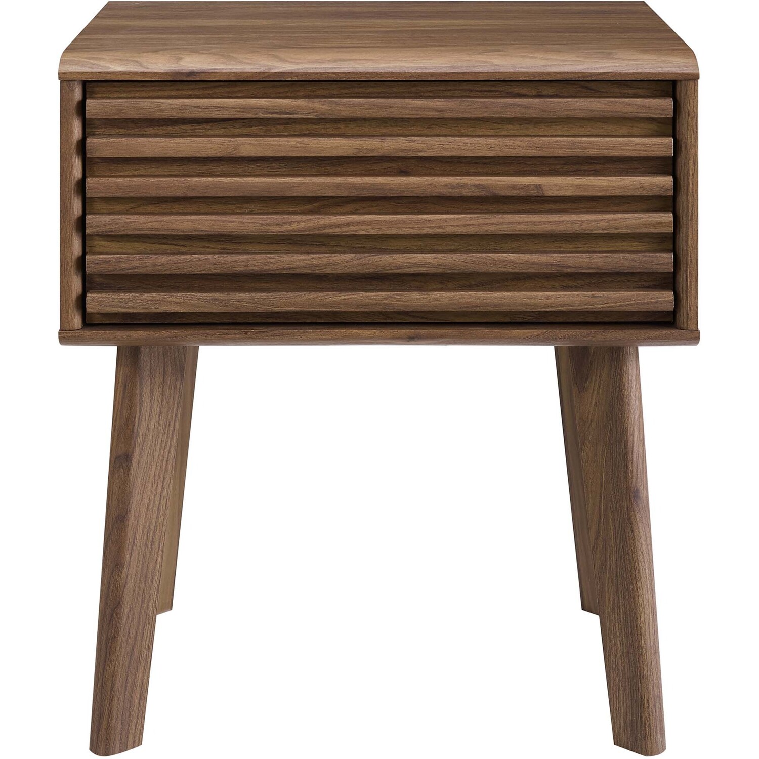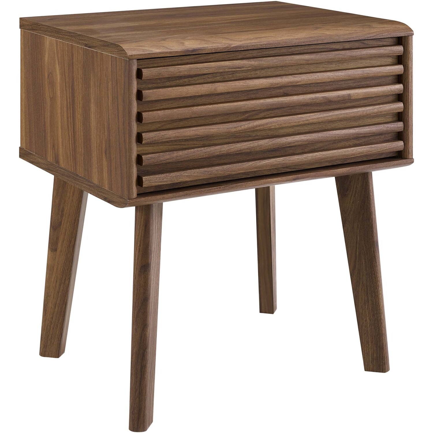 Tap into mid-century aesthetics with the Render End Table Nightstand. This bedside or living room side table features a durable particleboard frame with smooth walnut grain laminate, four tapered wood legs, and full-extension glide storage drawer. Boasting a mid-century modern style this accent table features a solid construction with a pleasing look and practical functionality.Mid-Century Nightstand