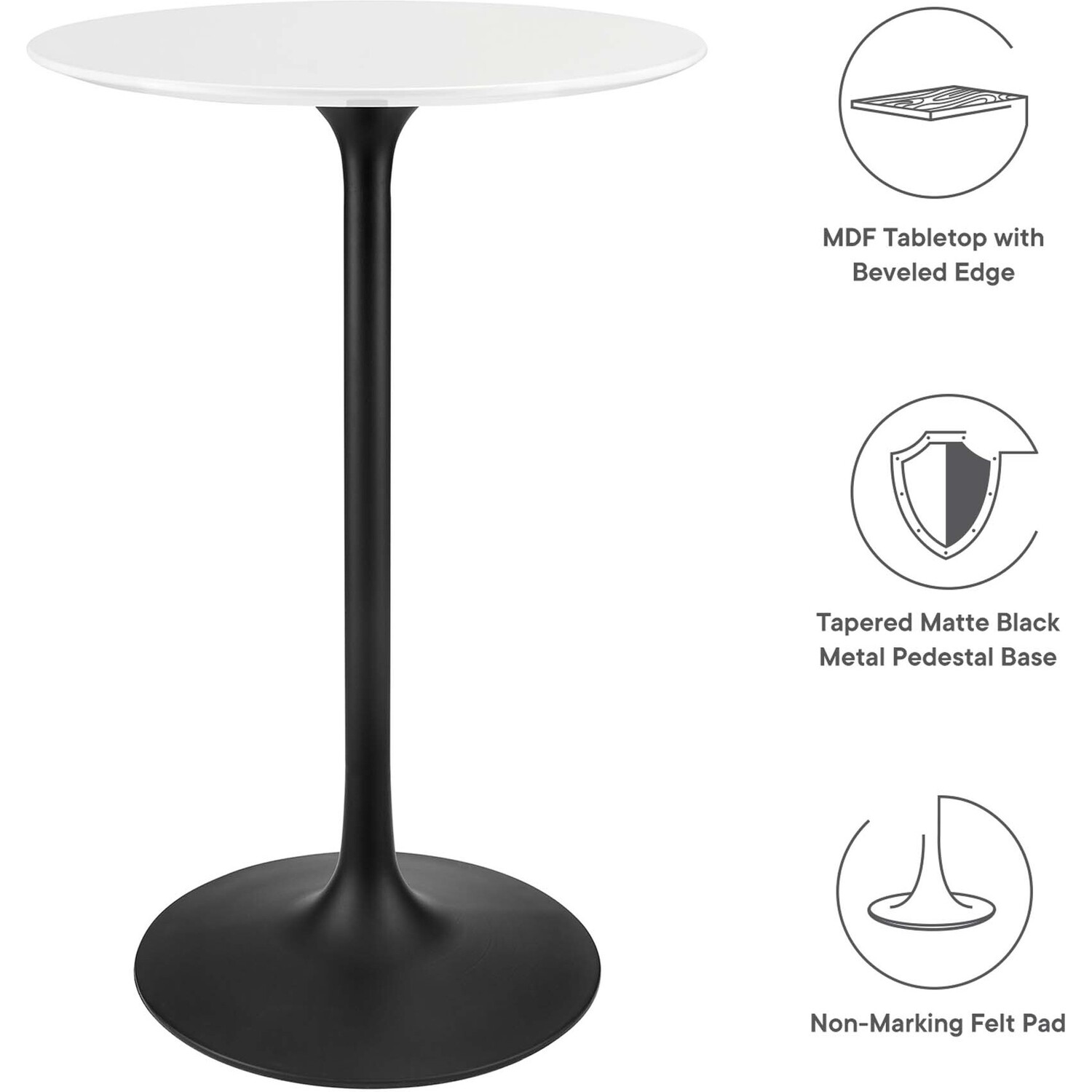 Let modern inspiration flow while gathered around the Lippa 28" Round Bar Table. Perfect for entertaining family and friends or everyday dining, this pedestal table comfortably seats two. Its round tabletop is crafted with MDF with a high gloss finish and beveled edge for a contemporary yet timeless design. Embodying an iconic mid-century silhouette, this pedestal bar-height table floats on a sleek tapered metal pedestal base with a chip-resistant black powder-coated finish. Includes non-marking felt pad to protect flooring. Assembly required.Modern Bar Table