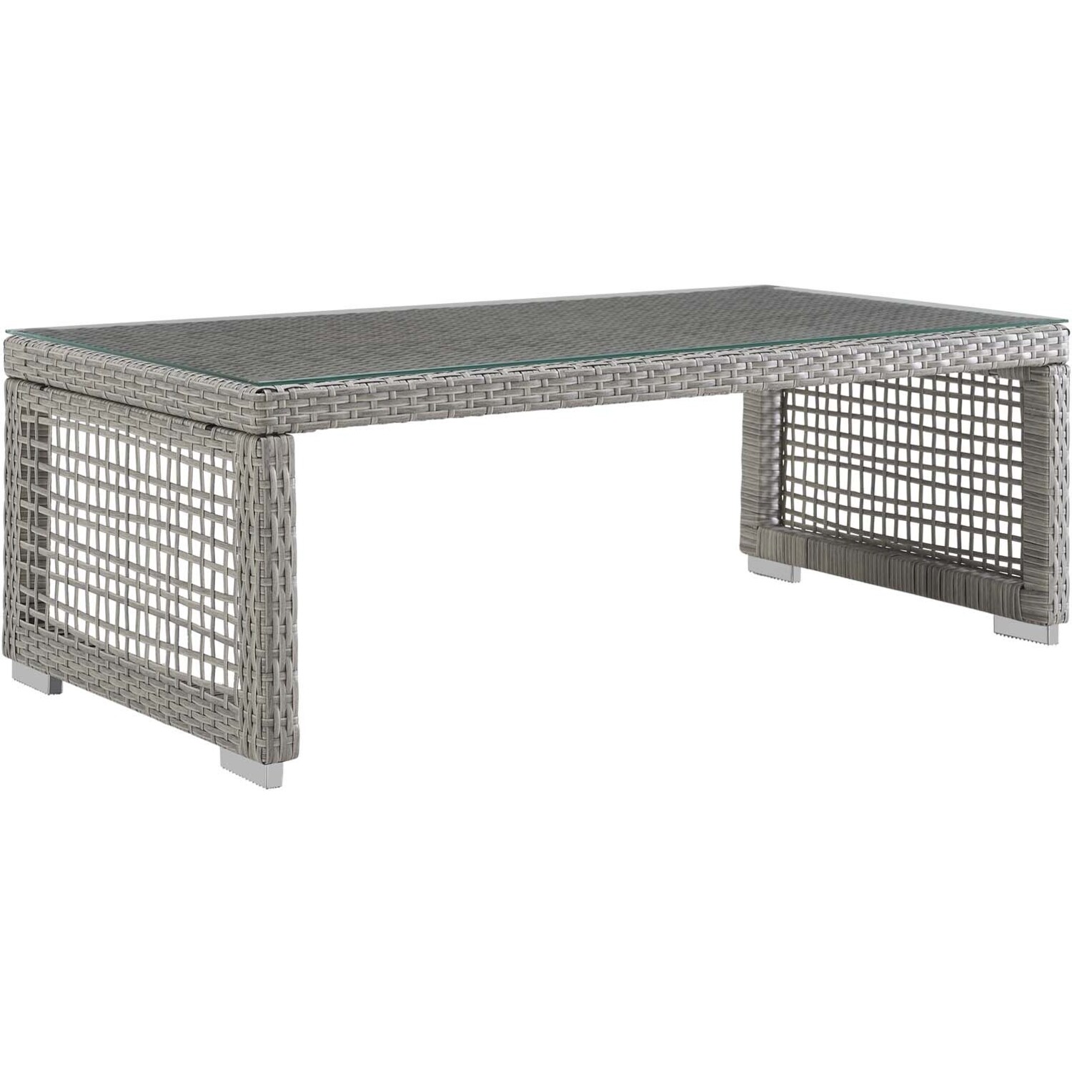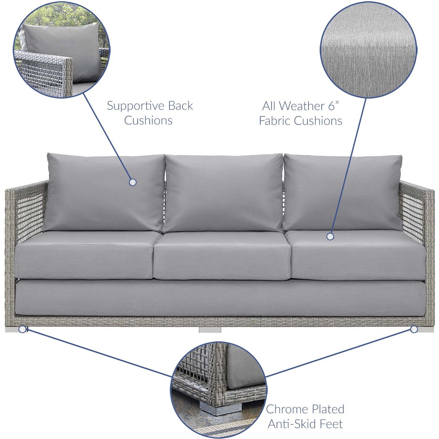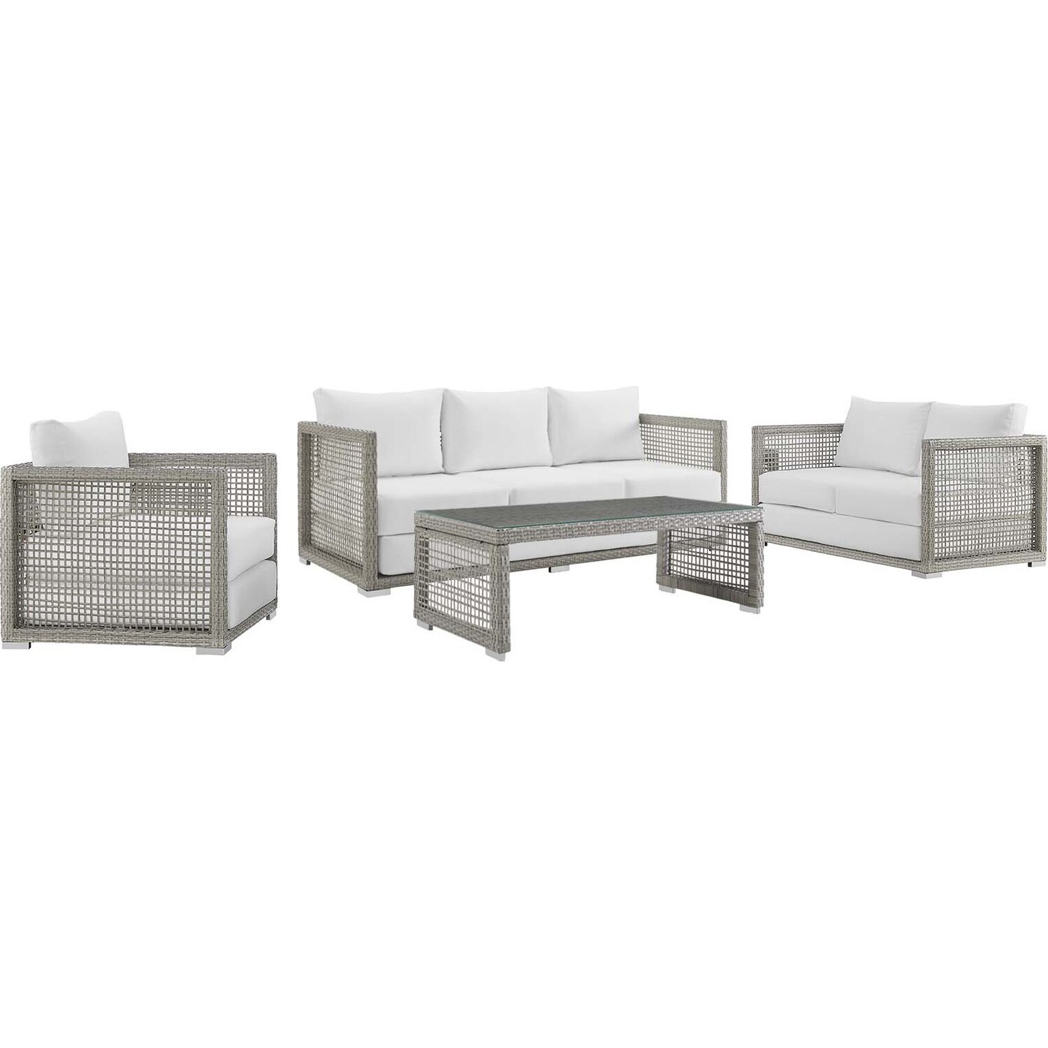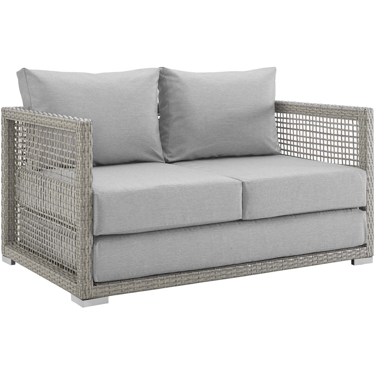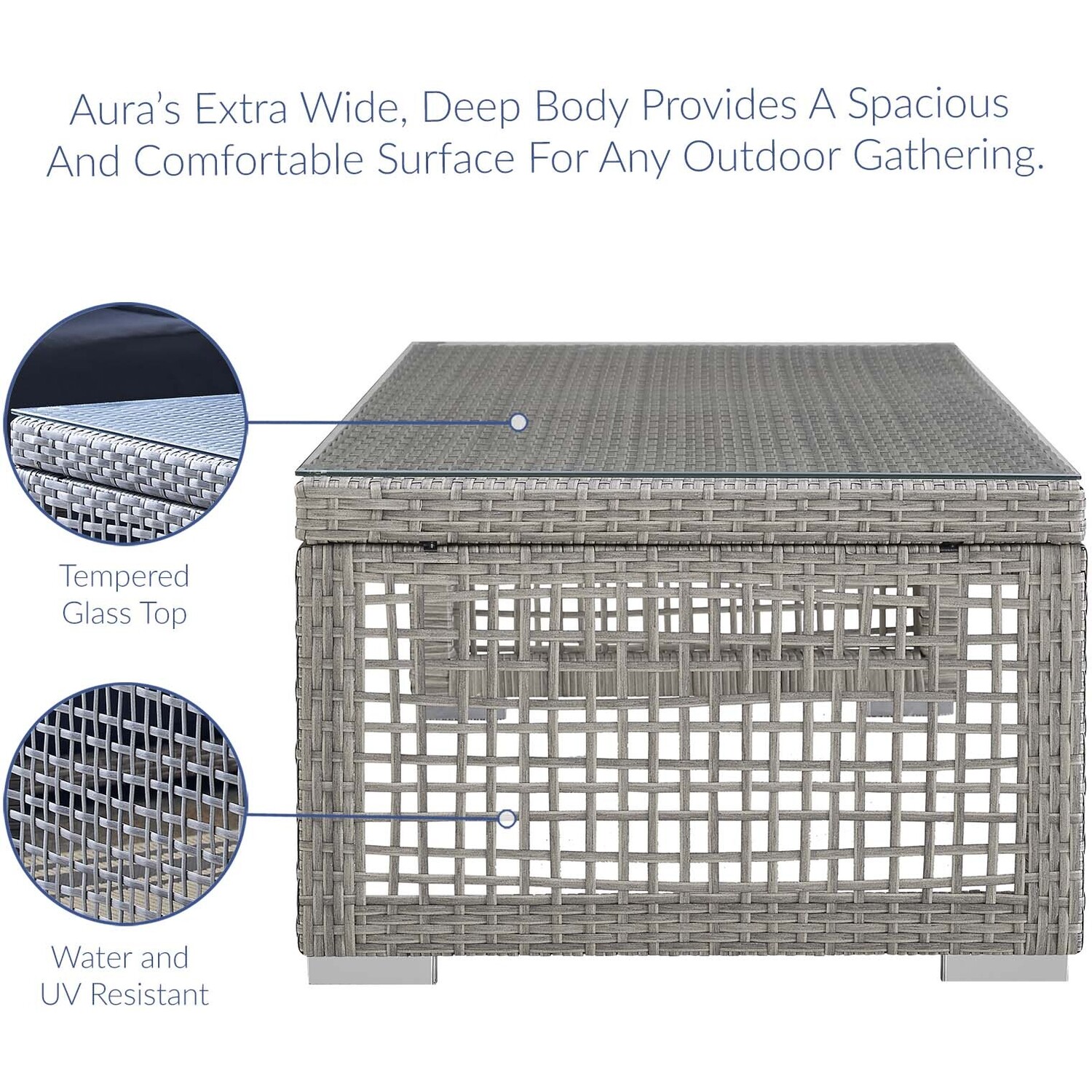 Weave conversational threads into a rollicking good time with Aura Outdoor Patio Collection. Aura comes with a synthetic gray-on-gray tone wicker rattan weave and a powder-coated aluminum frame that delivers a softly versatile outdoor collection that shifts to meet the needs of the moment. Outfitted with machine washable and fade resistant all-weather fabric cushions, and designed with an extra wide and deep body, Aura will make your outdoor spot the focal point of good memories and festive gatherings while enhancing your patio, backyard or poolside arena. Featuring thick cushions and chrome plated anti-skid feet, enjoy spacious seating and enhanced comfort with this reliable piece of outdoor furniture. Comes fully assembled.Modern Outdoor Patio Collection