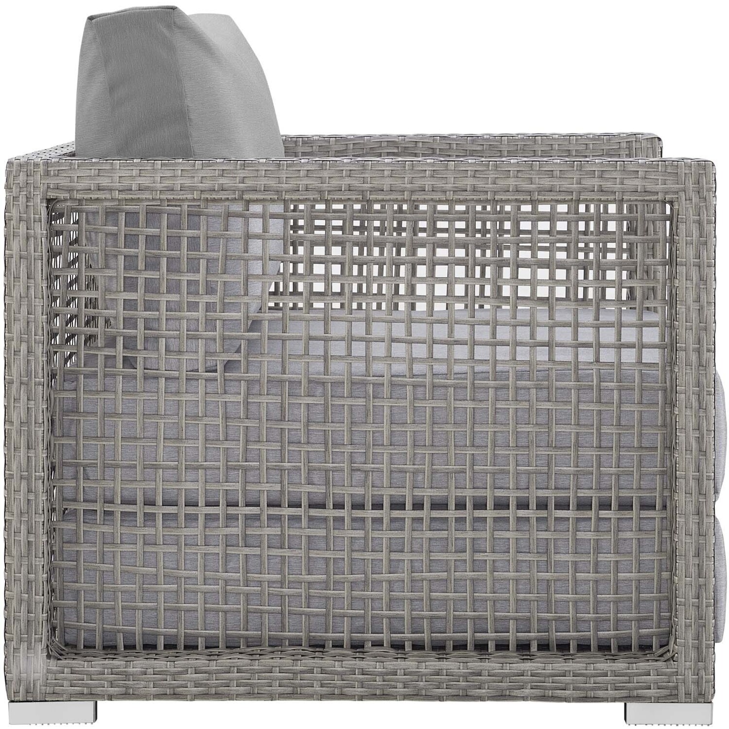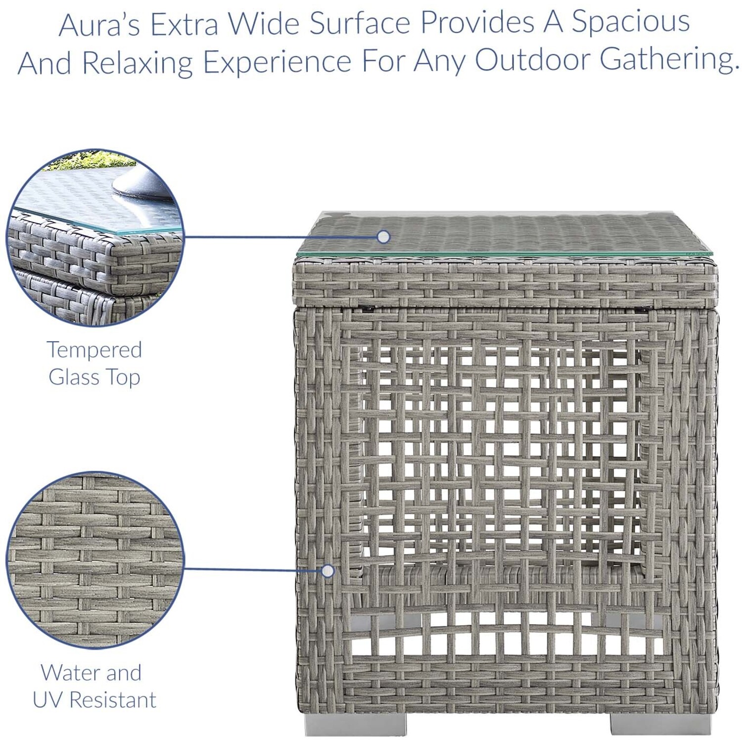 Weave conversational threads into a rollicking good time with Aura Outdoor Patio Collection. Aura comes with a synthetic gray-on-gray tone wicker rattan weave and a powder-coated aluminum frame that delivers a softly versatile outdoor collection that shifts to meet the needs of the moment. Outfitted with machine washable and fade resistant all-weather fabric cushions, and designed with an extra wide and deep body, Aura will make your outdoor spot the focal point of good memories and festive gatherings while enhancing your patio, backyard or poolside arena. Featuring thick cushions and chrome plated anti-skid feet, enjoy spacious seating and enhanced comfort with this reliable piece of outdoor furniture. Comes fully assembled.Modern Outdoor Patio Collection