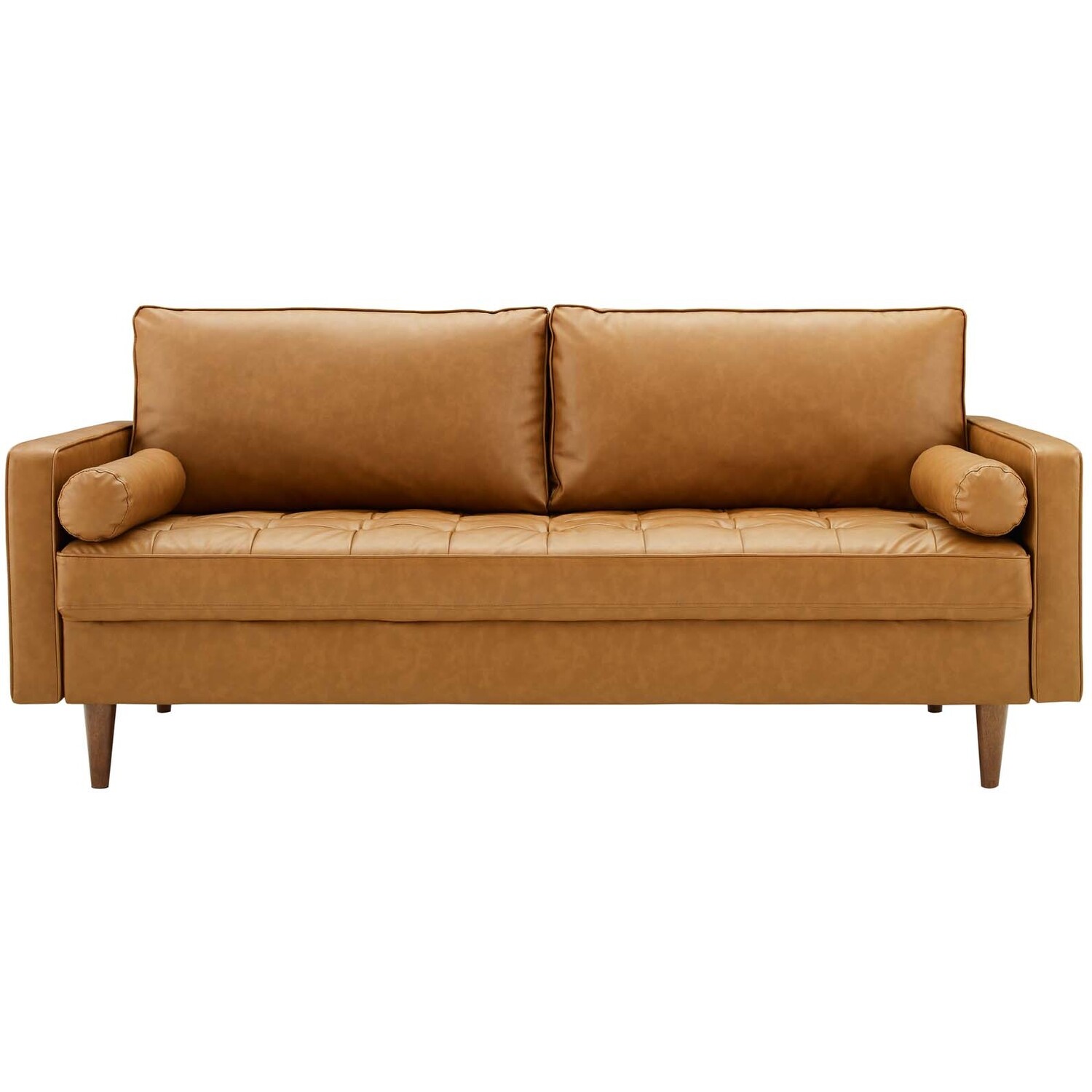 Embolden your living space with the modern style and everyday comfort of the Valour Faux Leather Sofa. Designed with a sophisticated silhouette, this faux leather couch features elegant biscuit tufting on the seat cushion and comes complete with two bolster pillows for added support. Upholstered in rich vegan leather, this tufted faux leather couch grants a sleek, luxe look that enhances any décor. With dense foam padding and a sinuous spring support system, the Valour Vegan Leather Couch provides a truly inviting seating experience perfect for any living room, office, or entertainment area. The wood legs and non-marking floor glides add a touch of mid-century flair while protecting your floors. From its retro-inspired design to its modern comfort, the Valour faux leather upholstered sofa is the perfect addition to your home decor. Assembly required. 3 Seater Sofa Weight Capacity: 900 lbs.Faux Leather Upholstery