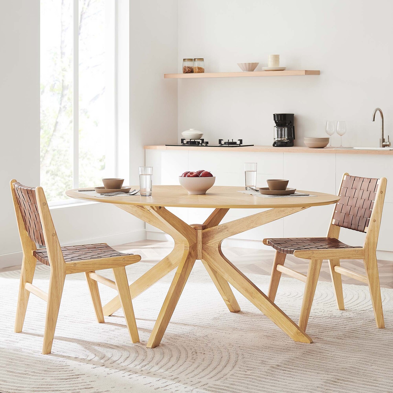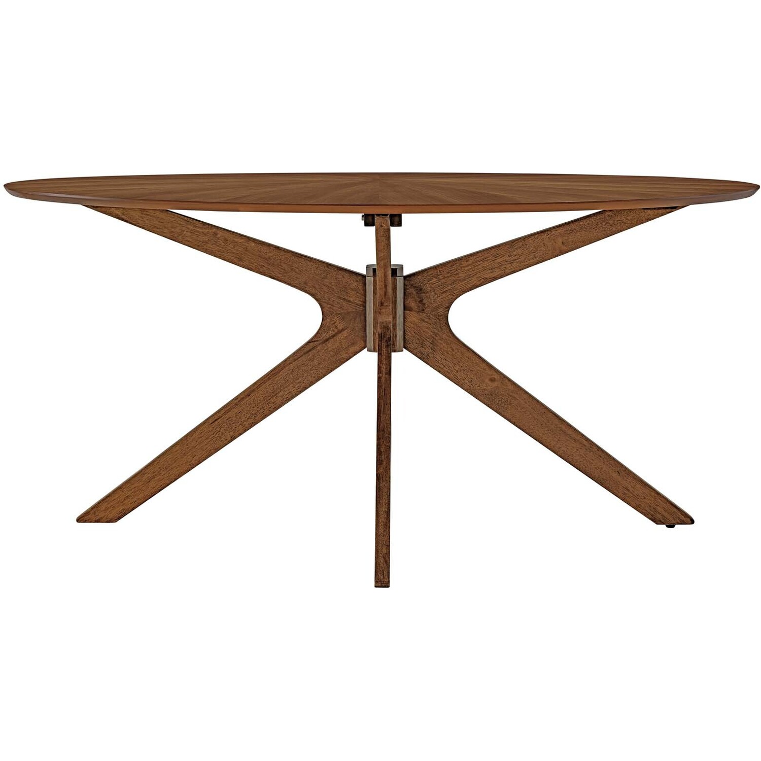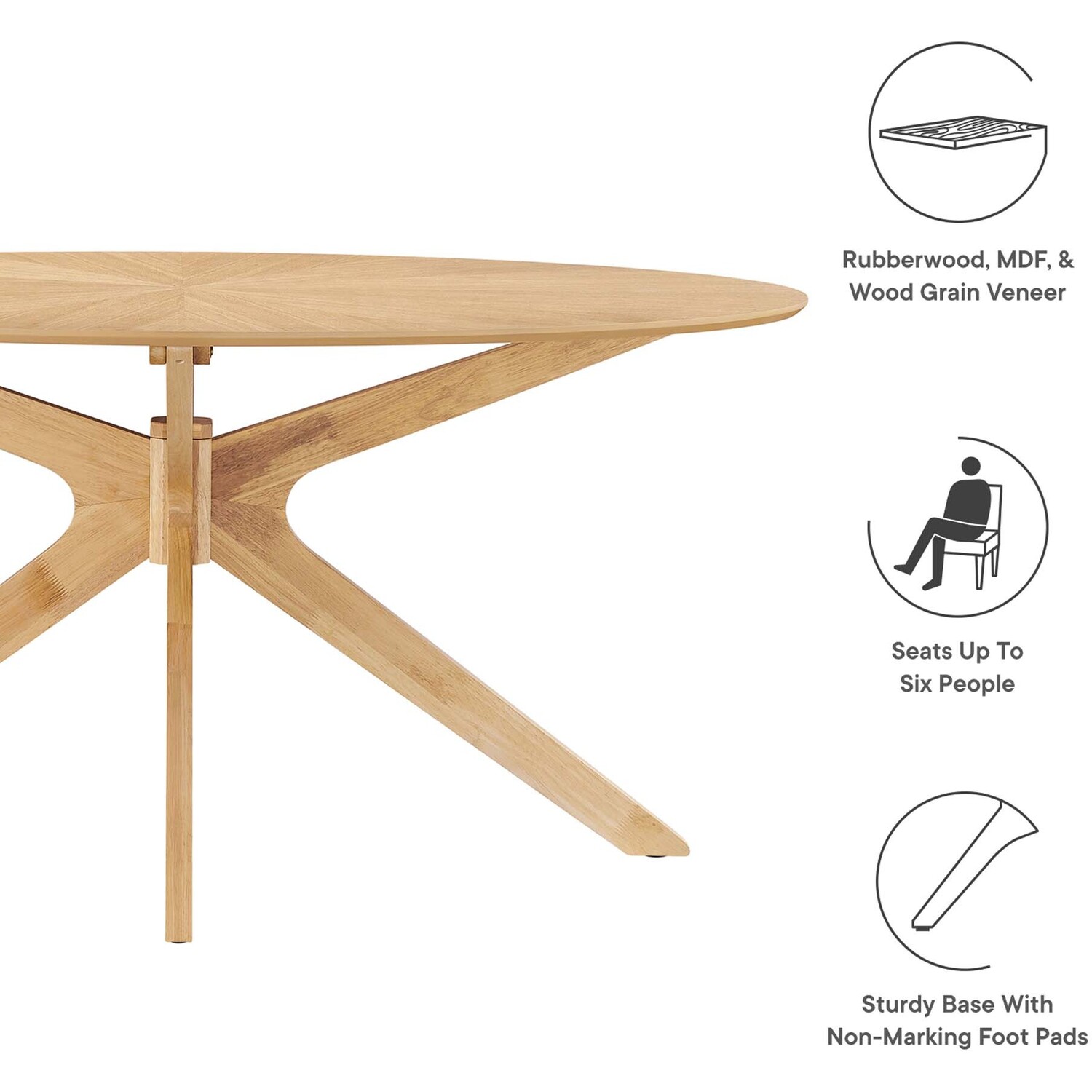 Invite the lighthearted banter and deep conversations that make gatherings memorable as you circle around the Crossroads 63" Oval Wood Dining Table. Sturdily constructed from rubberwood and MDF, the Crossroads Dining Table has a beautiful ash wood grain veneer finish. A unique base made of intersecting wooden legs supports the eye-catching oval dining table that will be the focal point of your dining room decor. Crossroads seats up to six people and is ideally suited for the dining room, kitchen, breakfast nook, or other dining area in your modern home or apartment. Weight Capacity: 400 lbs.Mid Century Modern Table