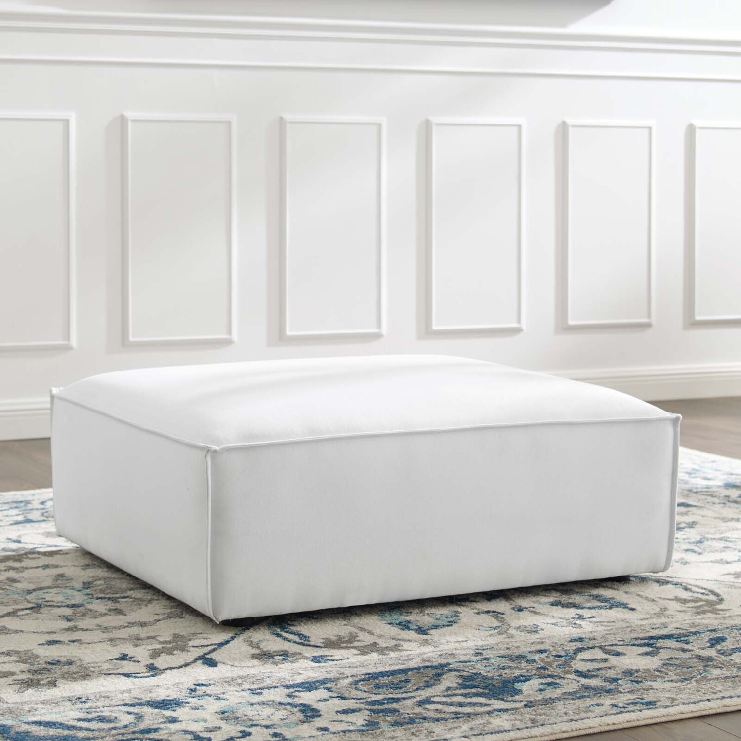 Create your custom living room and lounge area with the Restore Upholstered Fabric Sectional Sofa Ottoman. The Restore Ottoman appeals to minimalist elegance with a crisp design and broad lines accented with French piping details and polyester fabric upholstery. Dense foam padding and a pocket coil spring system in the cushions offer a luxe seating experience for your living room and lounge. The Restore Ottoman is solidly constructed from plywood and wood with non-marking foot caps to protect flooring and connectors between modular pieces. Ottoman Weight Capacity: 440 lbs.Sectional Sofa Ottoman