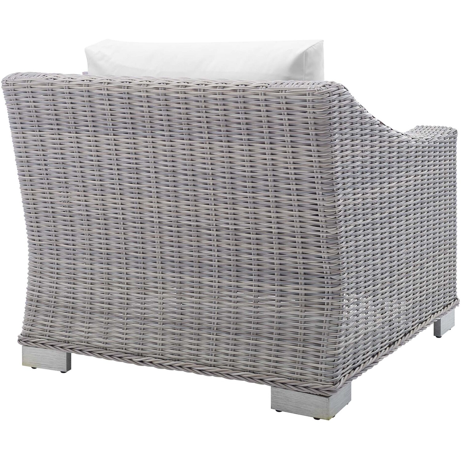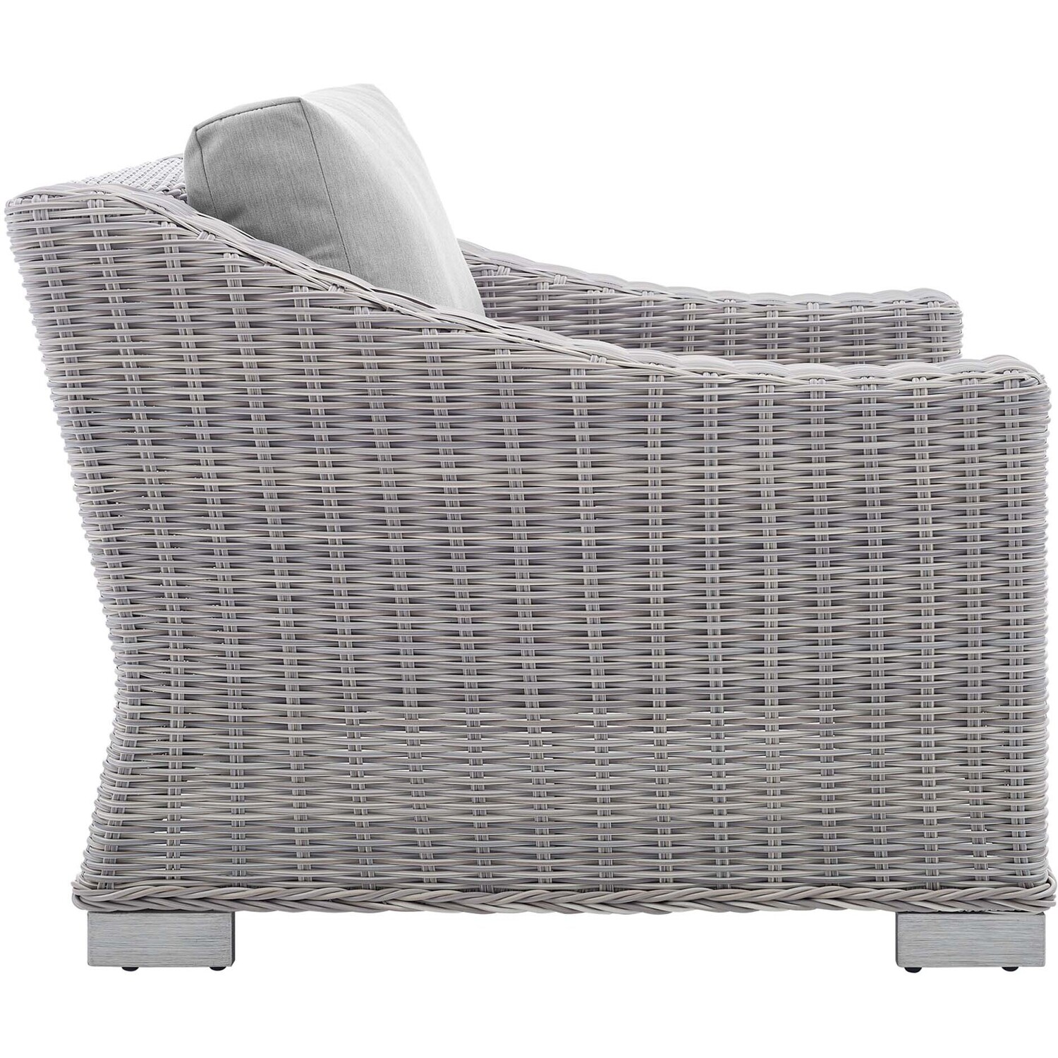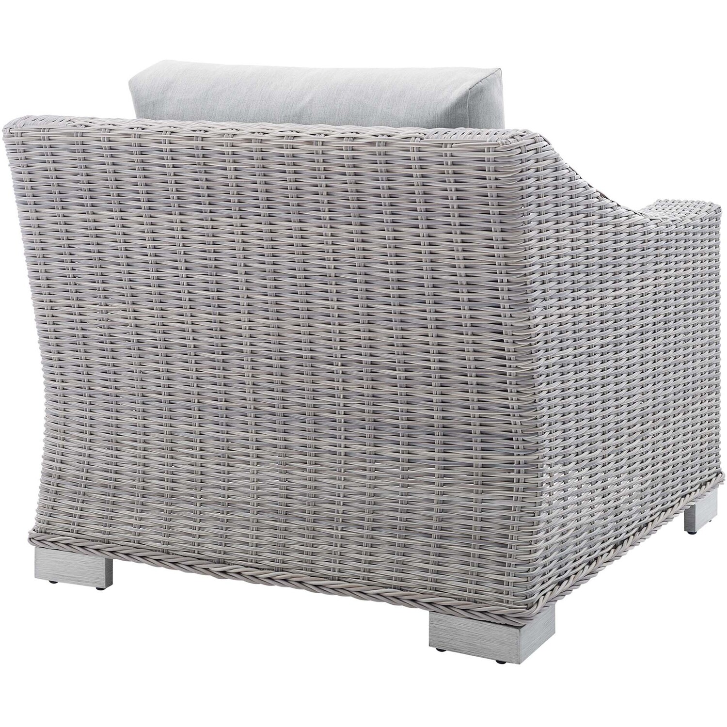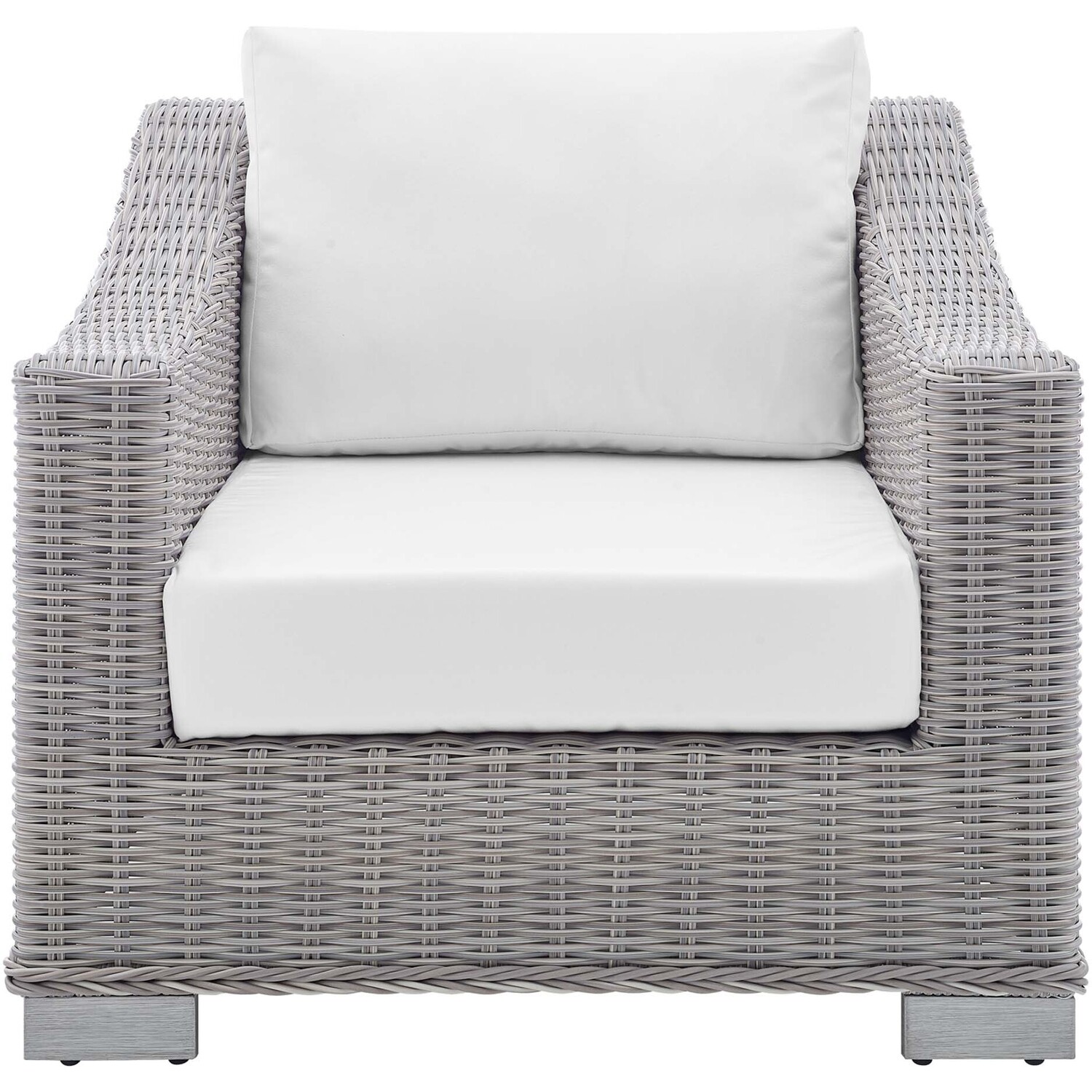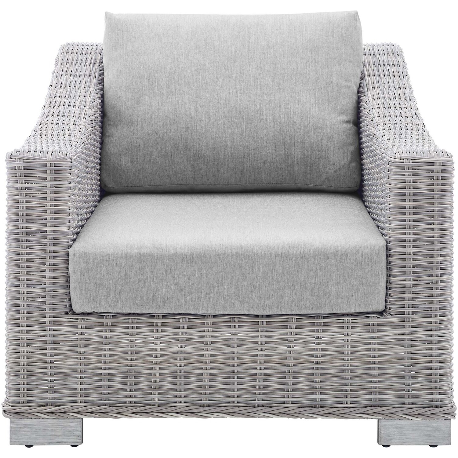 Enjoy fresh air and alfresco relaxation with the Conway Outdoor Patio Wicker Rattan Armchair. Wrapped in UV-resistant light gray synthetic wicker rattan, this patio chair boasts organic texture and a neutral hue that brings a calming presence to your outdoor space. The frame of this outdoor chair is crafted with durable powder-coated aluminum and rests on L-shaped legs with plastic foot glides. Thick foam padded cushions covered with washable water-resistant Sunbrella® fabric covers offer a comfortable seat and affix securely to the lounge chair with cord tension attachments. Trending aesthetics and a classic design define this outdoor patio furniture collection making it a beautiful addition to any outdoor space including the backyard, patio, porch, balcony, or poolside. Assembly required. Patio Chair Weight Capacity: 300 lbs.Outdoor Patio Chair