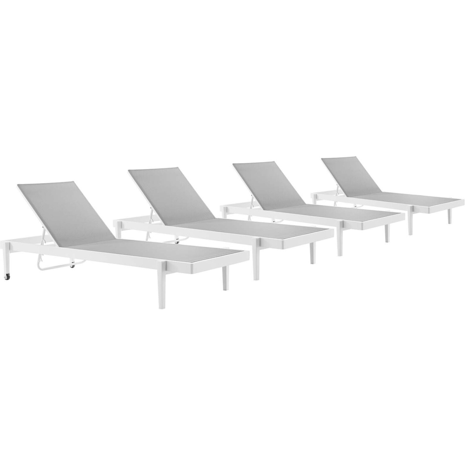 Streamline the style of your outdoor decor with the Charleston Outdoor Patio Aluminum Chaise Lounge Chair Set of 4. Charleston Patio Lounge Chair Set has sleek minimalist lines that mix and match with a variety of patio furniture. Height adjustable with three levels, this patio chaise chair personalizes to your needs with ease. Rolling dual wheels allow for effortless custom positioning on your patio, poolside, backyard, deck, or other outdoor seating area. All-weather Textilene mesh fabric provides durable support with easy-to-clean usage and allows natural airflow during relaxation.Chaise Weight Capacity: 341 lbsAll-Weather Textilene Mesh Fabric