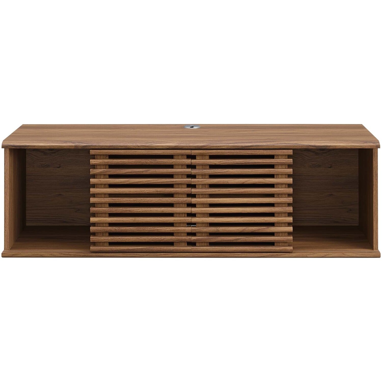 Tap into mid-century aesthetics with the Render 46" Wall-Mount TV Stand. This installment of the Render collection features a durable particleboard frame with smooth walnut grain laminate, an adjustable center shelf, two cable management holes, and two sliding doors for concealed shelf storage. Mounting directly to the wall with a drywall friendly cleat, this versatile mid-century modern living room table features a solid construction with a pleasing look and practical functionality. Perfect for media storage, Render accommodates flat-screen TVs up to 50" wide.Mid-Century Modern TV Stand