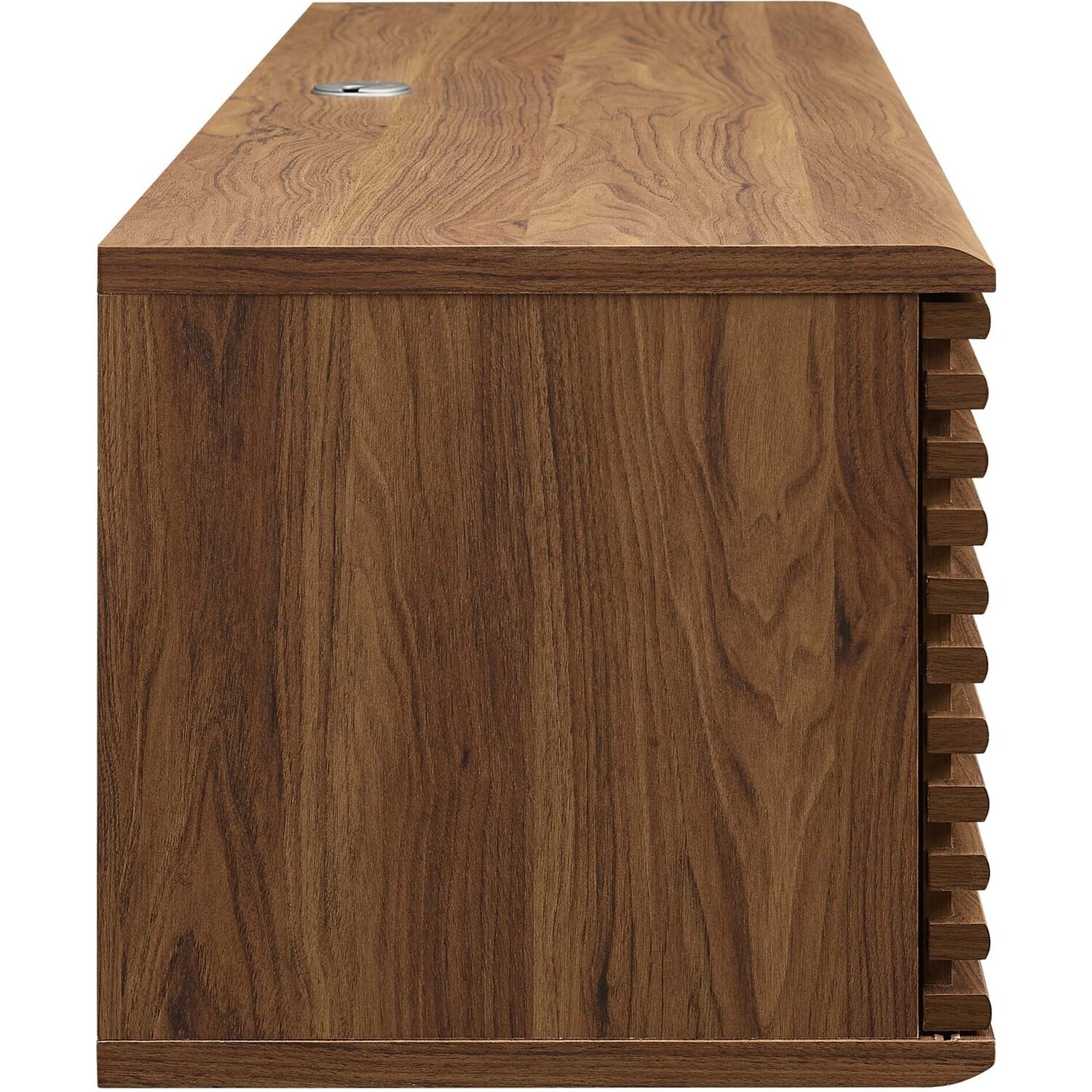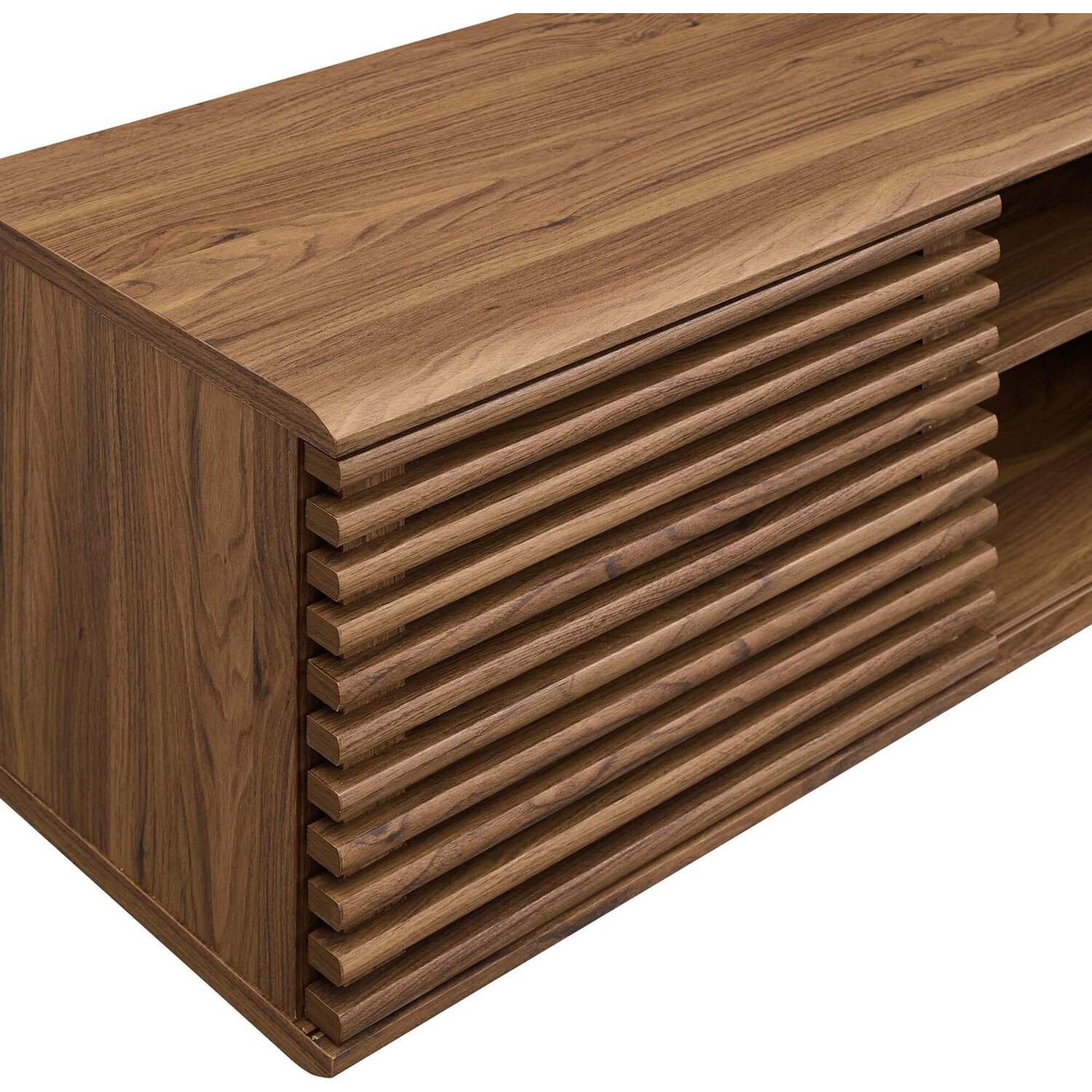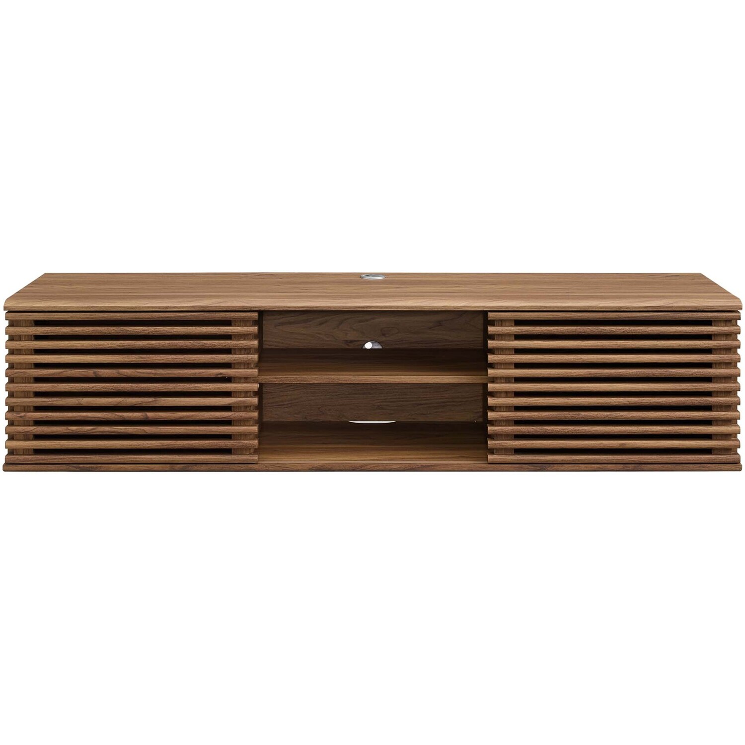 Tap into mid-century aesthetics with the Render 60" Wall-Mount TV Stand. This installment of the Render collection features a durable particleboard frame with smooth walnut grain laminate, an adjustable center shelf, two cable management holes, and two sliding doors for concealed shelf storage. Mounting directly to the wall with a drywall friendly cleat, this versatile mid-century modern living room table features a solid construction with a pleasing look and practical functionality. Perfect for media storage, Render accommodates flat-screen TVs up to 65" wide.Mid-Century Modern TV Stand