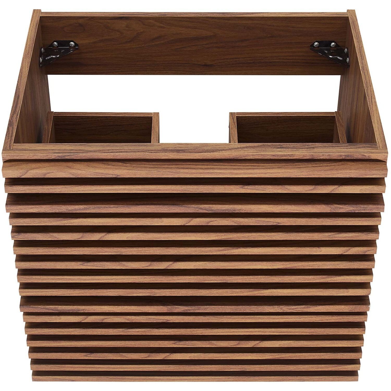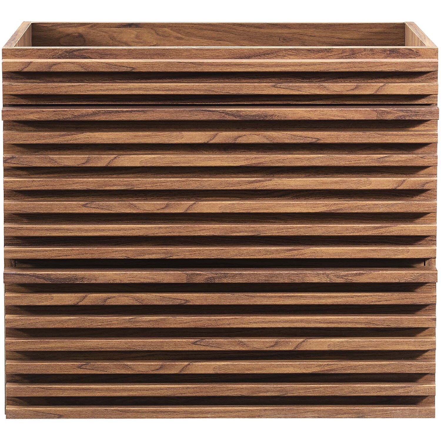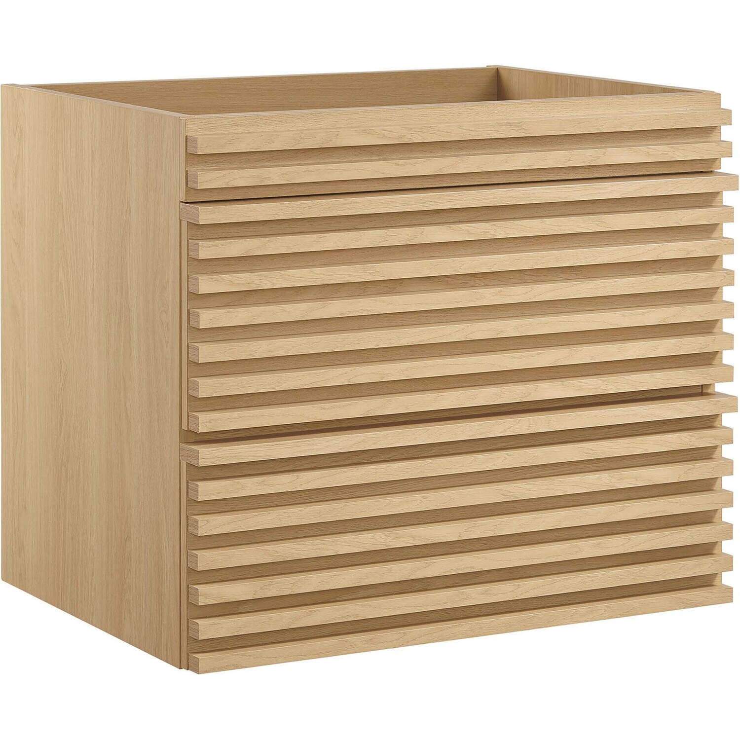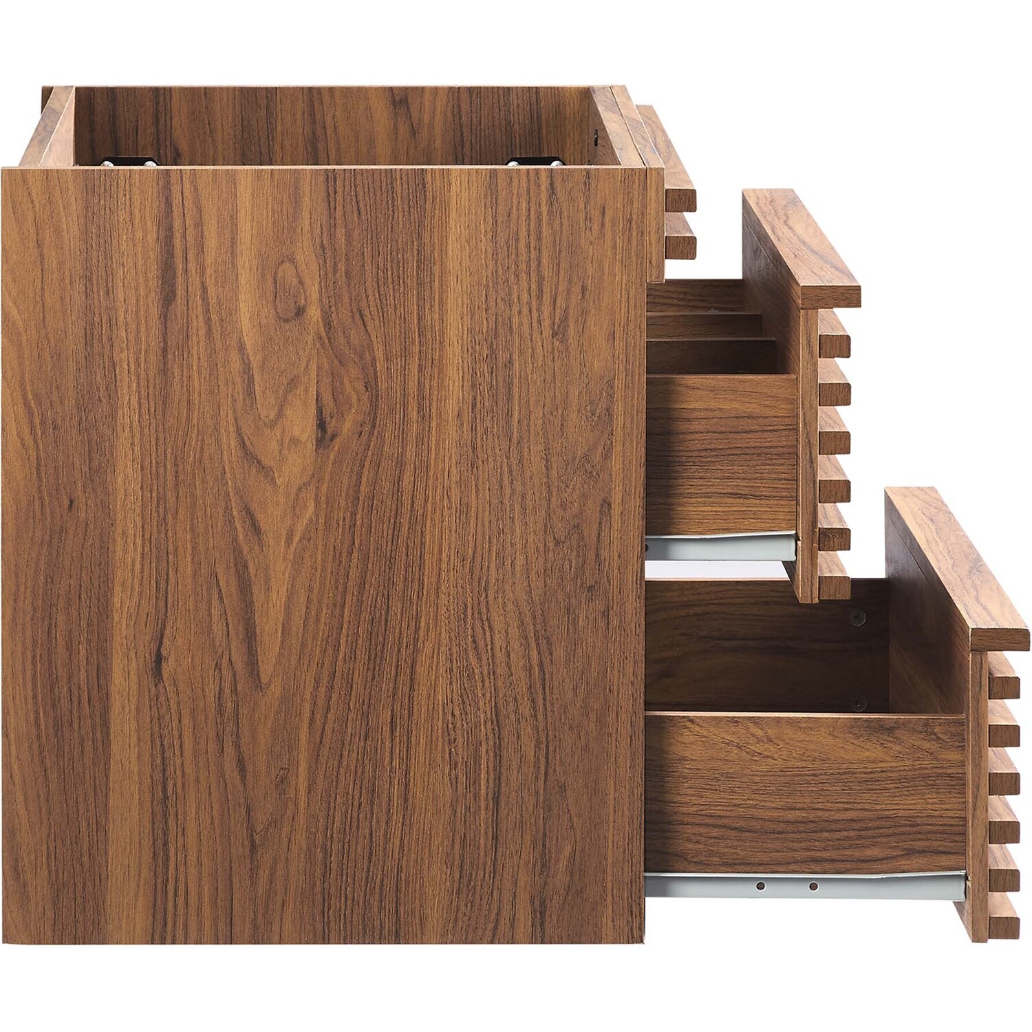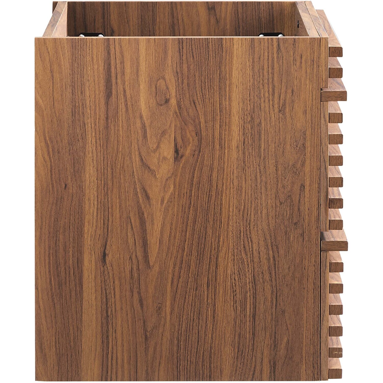 Tap into mid-century aesthetics with the Render Vanity. The Render 24" Bathroom Vanity features a durable MDF and particleboard frame with smooth walnut grain laminate, ample storage space in two full-extension drawers, and space-saving wall-mount design with a drywall friendly mounting cleat. Clean lines and crisp design align for an edgy style designed to meet your needs. Boasting a mid-century modern style this vanity features a solid construction with a pleasing look and practical functionality. Assembly required and fixtures not included.Mid-Century Modern Vanity